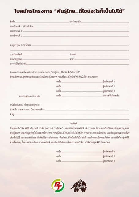 · ส่งผลงานออกแบบในรูปแบบไฟล์ดิจิทัล (Adobe Photoshop, Illustrator ฯลฯ) ความละเอียด 300dpi