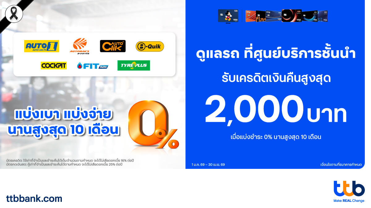 ทีทีบี มอบความคุ้มค่าให้ผู้ถือบัตรเครดิตและบัตรกดเงินสด ttb จับมือเป็นพันธมิตรร่วมกับศูนย์ดูแลรถยนต์ 8 ศูนย์บริการชั้นนำที่มีสาขาครอบคลุมทั่วประเทศ ได้แก่ AUTO 1, AUTO BACS, AUTOCLIK, B-QUIK, COCKPIT, EZY FIT, FIT Auto และ TYREPLUS พร้อมมอบโปรโมชันสุดพิเศษสำหรับคนมีรถ เพียงมียอดใช้จ่ายค่าบริการหรือสินค้าตามที่ศูนย์บริการกำหนด รับสิทธิพิเศษแบ่งชำระดอกเบี้ย 0% นานสูงสุด 10 เดือน และรับเครดิตเงินคืนสูงสุด 2,000 บาท / ท่าน / เดือน (คำนวณรวมบัตรหลักทุกใบและบัตรเสริม) ตั้งแต่วันที่ 1 มกราคม 2569 – 30 เมษายน 2569