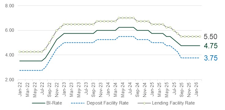 · ศูนย์วิจัยกสิกรไทย มองว่า ยังมีแนวโน้มลดดอกเบี้ยได้แต่ยังต้องรอจังหวะที่ค่าเงินกลับมามีเสถียรภาพ โดยในช่วงครึ่งแรกของปีปัจจัยกำหนดนโยบายระยะสั้นยังคงเป็นเรื่องค่าเงินและเงินทุนเคลื่อนย้าย หากแรงกดดันค่าเงินเริ่มคลี่คลายและความเชื่อมั่นนักลงทุนกลับมาในช่วงครึ่งหลังปี 2026 มีโอกาสที่ BI จะปรับลดดอกเบี้ยได้อีกประมาณ 2 ครั้ง สู่ระดับราว 4.25%