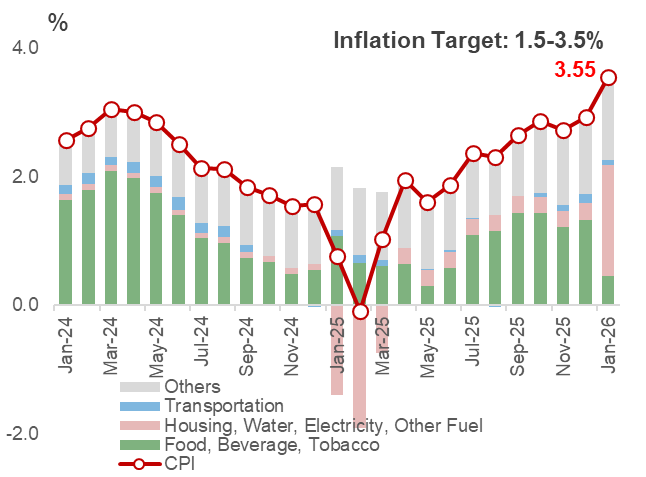 · เงินเฟ้อปรับสูงขึ้นแต่เป็นปัจจัยชั่วคราวไม่ใช่แรงกดดันเชิงโครงสร้าง โดยเงินเฟ้อเดือน ม.ค. อยู่ที่ 3.55% เพิ่มขึ้นจากผลจากฐานต่ำในปีก่อนที่มีมาตรการการลดค่าไฟฟ้า ขณะที่เงินเฟ้อพื้นฐานยังต่ำ 2.45% และเงินเฟ้ออาหารอาหารผันผวนอยู่ที่ 1.14% สะท้อนว่าแรงกดดันด้านราคายังไม่ได้กระจายตัวในวงกว้าง ดังนั้น เงินเฟ้อจึงยังไม่ใช่ข้อจำกัดหลักของการลดดอกเบี้ย ต่างจากปัจจัยค่าเงินและเงินทุนเคลื่อนย้ายที่มีน้ำหนักมากกว่าในช่วงนี้
