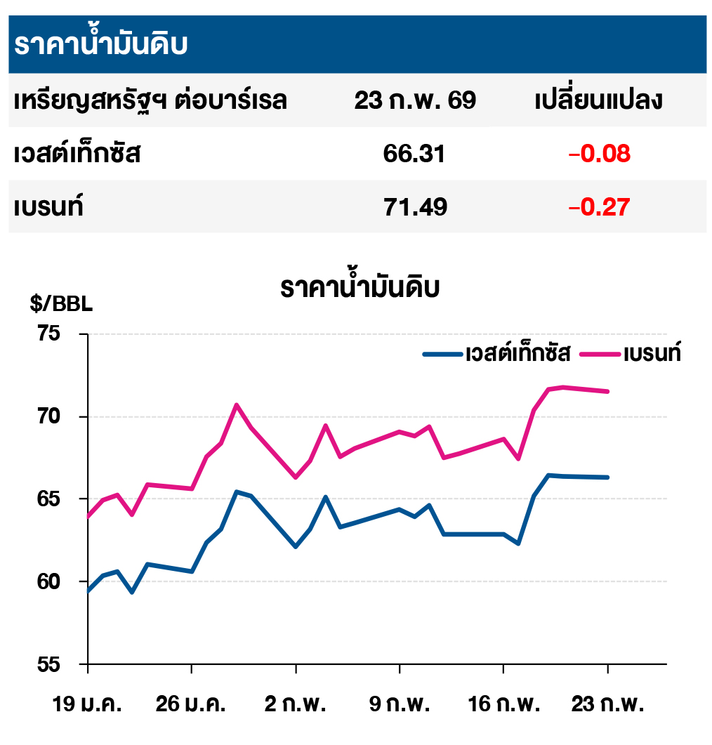 (-) ราคาน้ำมันดิบเวสต์เท็กซัสและเบรนท์ปรับลดลง หลังประธานาธิบดีของอิหร่านเผยว่า การพูดคุยหารือระหว่างสหรัฐฯ และอิหร่านมีสัญญาณเป็นไปในทิศทางที่ดี สอดคล้องกับท่าทีของรัฐมนตรีต่างประเทศของอิหร่านซึ่งเผยออกมาในช่วงก่อนหน้านี้ โดยการพูดคุยระหว่างสหรัฐฯ และอิหร่านครั้งถัดไปจะจัดขึ้นที่กรุงเจนีวา ประเทศสวิตเซอร์แลนด์ ในวันที่ 26 ก.พ. 69 นี้