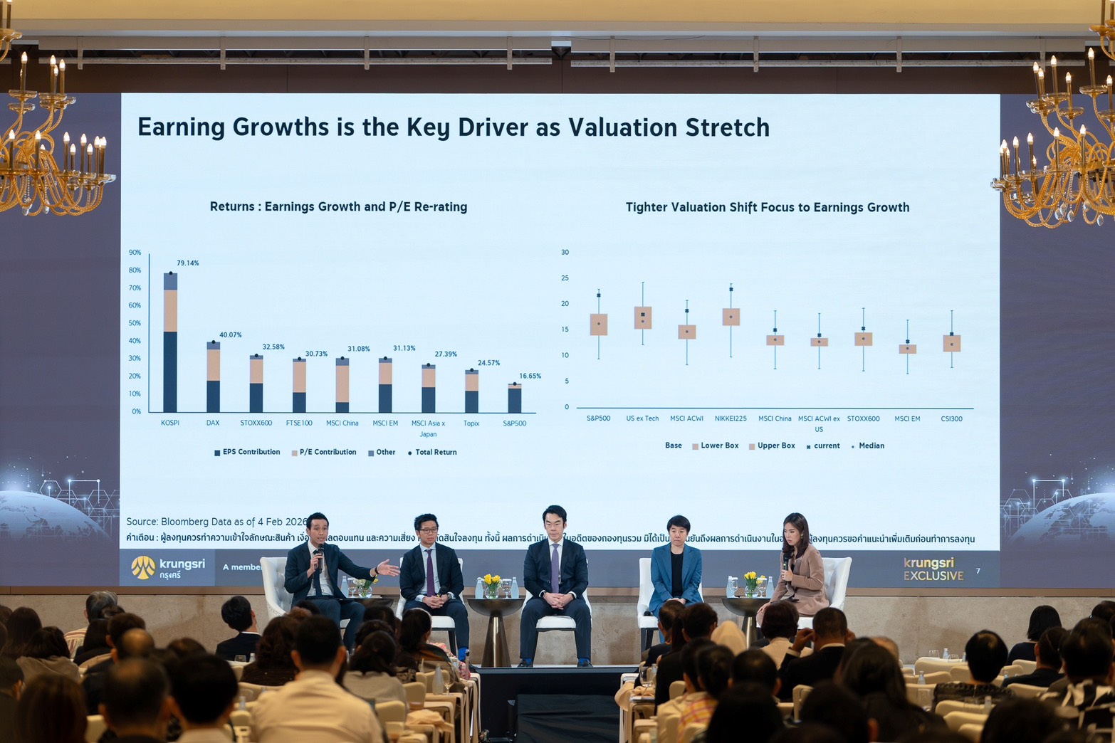 กรุงศรี (ธนาคารกรุงศรีอยุธยา จำกัด (มหาชน) และบริษัทในเครือ) จัดงานสัมมนา KRUGNSRI EXCLUSIVE Investment Outlook 2026: Building Resilient Portfolios in Volatile World โดยได้รับเกียรติจากผู้เชี่ยวชาญด้านเศรษฐกิจและการลงทุนของกรุงศรี และพันธมิตร อัปเดตมุมมองเศรษฐกิจและเทรนด์การลงทุนปี 2569 ให้กับลูกค้ากรุงศรี เอ็กซ์คลูซีฟ สรุปใจความสำคัญว่าปี 2569 แม้เริ่มเห็นสัญญาณเศรษฐกิจเข้าสู่วัฏจักรฟื้นตัว แต่ความเสี่ยงภูมิรัฐศาสตร์และปัจจัยเชิงโครงสร้างยังเป็นแรงกดดันสำคัญ ขณะที่กลยุทธ์ลงทุนควรให้น้ำหนักหุ้นมากกว่าตราสารหนี้ กระจายความเสี่ยง ลดการกระจุกตัวในหุ้นเทคฯใหญ่สหรัฐฯ ไปยังหุ้นขนาดกลาง-เล็ก หุ้นวัฏจักร และตลาดเกิดใหม่ พร้อมเน้นการบริหารพอร์ตอย่างยืดหยุ่น เพื่อรับโอกาสฟื้นตัวอย่างมีคุณภาพ