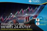 มูลค่าส่งออกเดือน ม.ค. 69 อยู่ที่ 31,573.1 ล้านดอลลาร์ฯ ขยายตัว 24.4%YoY เร่งขึ้นจากเดือนก่อนที่ 16.8%YoY สำหรับการส่งออกทองคำในเดือนนี้เติบโตสูงถึง 123.8%YoY ทั้งนี้ หากไม่รวมทองคำมูลค่าส่งออกจะขยายตัวที่ 20.1%YoY โดยมีแรงขับเคลื่อนสำคัญมาจากสินค้าอิเล็กทรอนิกส์ เช่น เครื่องคอมพิวเตอร์ รถยนต์ และเครื่องโทรสาร เป็นต้น