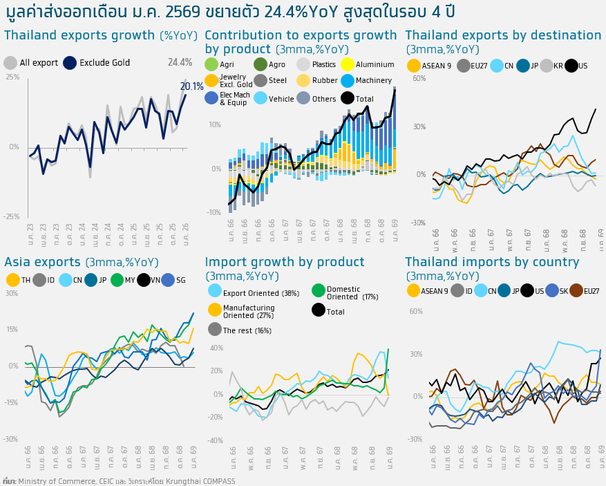 • มูลค่าส่งออกเดือน ม.ค. 2569 เติบโต 24.4%YoY เร่งขึ้นจากเดือนก่อนที่ 16.8%YoY จากการส่งออกทองคำที่เติบโตสูงถึง 123.8%YoY ผนวกกับกลุ่มสินค้าอิเล็กทรอนิกส์และยานยนต์ที่ขยายตัวได้ดี โดยเฉพาะในตลาดสหรัฐฯ ด้านการนำเข้าขยายตัวเร่งขึ้นมาอยู่ที่ 29.4%YoY ตามการนำเข้าแผงวงจรไฟฟ้าและเครื่องจักร ส่งผลให้ดุลการค้าเดือน ม.ค. ขาดดุล 5,307.9 ล้านดอลลาร์ฯ สรอ..
