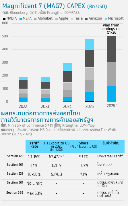 2) แนวโน้มการลงทุนของกลุ่ม Technology คาดว่าจะปรับสูงขึ้นต่อเนื่องตามการใช้งาน AI ที่ขยายตัวมากขึ้น ส่งผลดีต่อการส่งออกสินค้า Semi-conductor ของไทย โดยบริษัทเทคโนโลยีกลุ่ม MAG7 โดยเฉพาะที่เกี่ยวข้องกับ Data Center ในปีที่ผ่านมาลงทุนขยายตัวสูงถึง 62% และล่าสุด META, Alphabet และ Amazon คาดว่าปี 2569 จะขยายการลงทุนรวมกันแตะระดับ 5.1 แสนล้านดอลลาร์สหรัฐ (72%YoY) สอดคล้องการคาดการณ์ของ Deloitte1 ที่ประเมินว่ายอดขาย Semiconductor ของโลกจะพุ่งแตะระดับสูงสุดเป็นประวัติการณ์ที่ 9.8 แสนล้านดอลลาร์สหรัฐ (26%YoY) อย่างไรก็ตาม ต้องระวังความเสี่ยงจากการแย่งชิงกำลังการผลิตที่อาจดันราคาหน่วยความจำ ให้พุ่งสูงขึ้น รวมถึงข้อจำกัดด้านพลังงานไฟฟ้าและการคืนทุนของโครงการ Data Center ที่อาจกดดันให้ผู้ประกอบการต้องเริ่มปรับสมดุลการลงทุนไปยังโครงการอื่นมากขึ้น