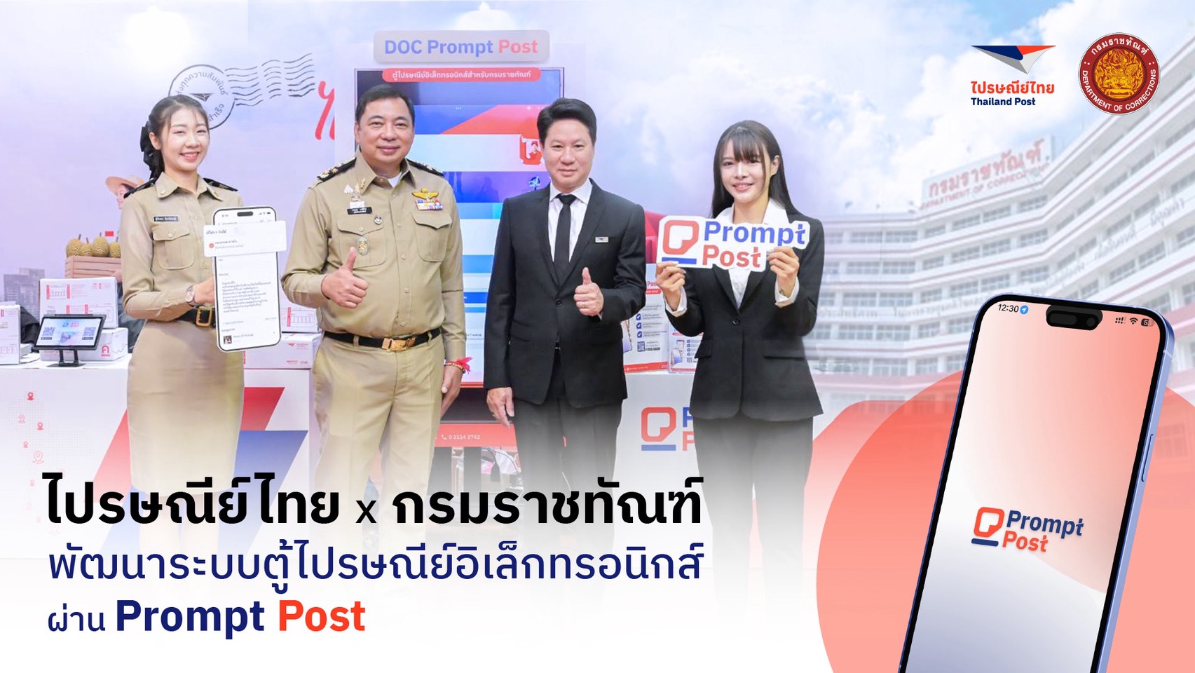 บริษัท ไปรษณีย์ไทย จำกัด ร่วมกับ กรมราชทัณฑ์ ลงนามบันทึกข้อตกลงความร่วมมือ (MOU) โครงการพัฒนาระบบตู้ไปรษณีย์อิเล็กทรอนิกส์สำหรับกรมราชทัณฑ์ (DOC Prompt Post) ภายใต้แพลตฟอร์ม Prompt Post ยกระดับการรับ - ส่งจดหมายอิเล็กทรอนิกส์ระหว่างผู้ต้องขังและญาติ ให้สะดวก รวดเร็ว และเป็นไปตามข้อกำหนดและขั้นตอนการปฏิบัติงานภายในเรือนจำ