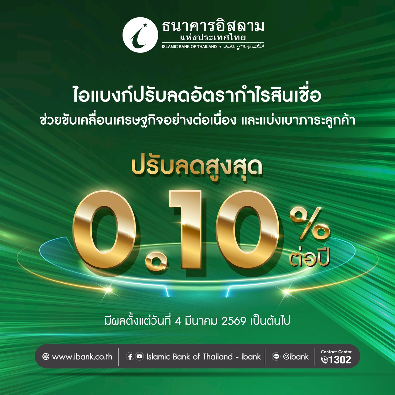 ธนาคารอิสลามแห่งประเทศไทย (ไอแบงก์) เดินหน้าสนับสนุนการฟื้นตัวของเศรษฐกิจไทยอย่างต่อเนื่อง ขานรับมติคณะกรรมการนโยบายการเงิน (กนง.) เมื่อวันที่ 25 กุมภาพันธ์ 2569 ด้วยการปรับลดอัตรากำไรสินเชื่อ ควบคู่กับการตรึงอัตราผลตอบแทนเงินฝาก เพื่อรักษาเสถียรภาพของระบบการเงิน และส่งผ่านประโยชน์ด้านต้นทุนทางการเงินไปยังภาคธุรกิจและประชาชน สอดคล้องกับทิศทางนโยบายเศรษฐกิจของภาครัฐ โดยให้มีผลตั้งแต่วันที่ 4 มีนาคม 2569 เป็นต้นไป