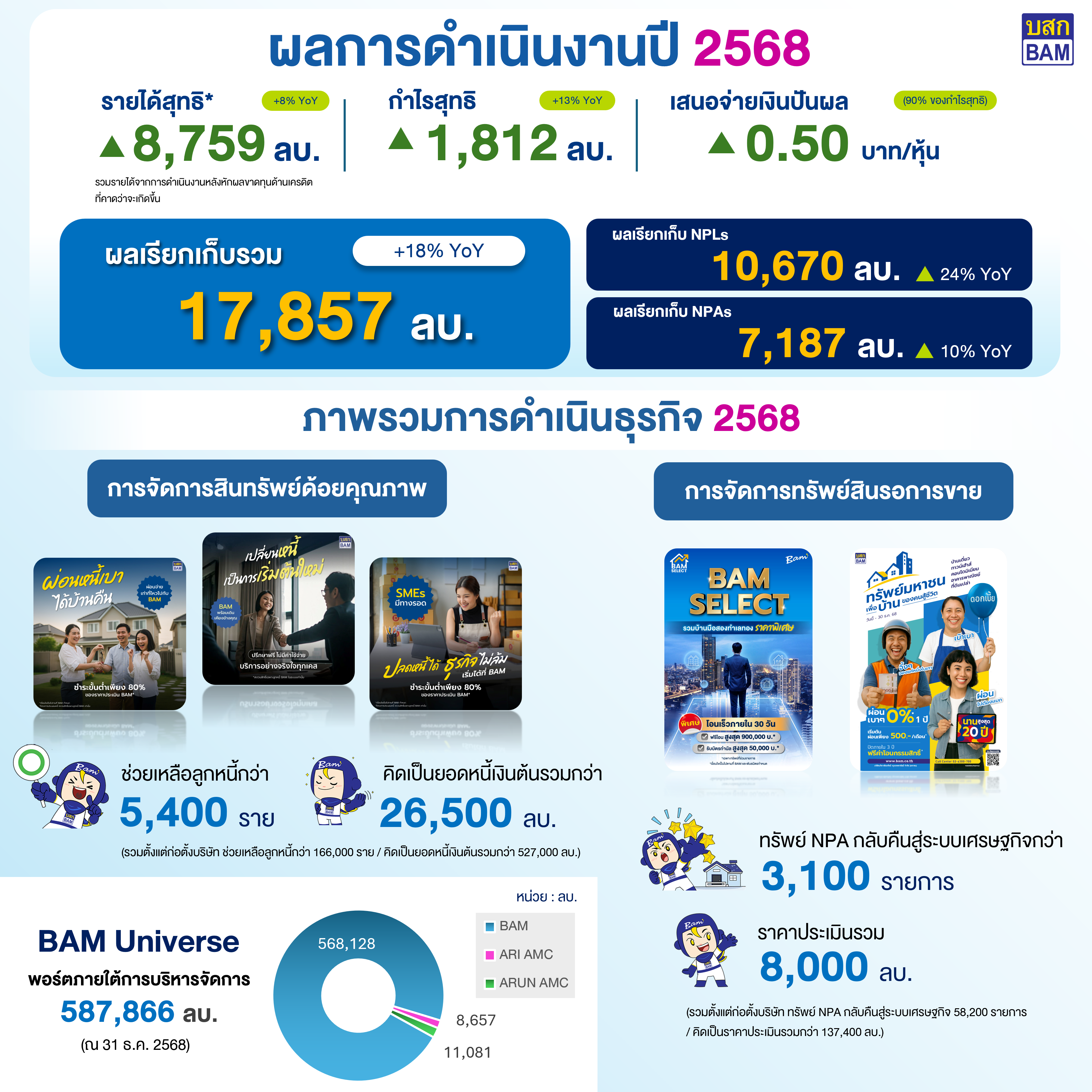 ทั้งนี้ ในปี 2568 บริษัท ฯ สามารถดำเนินภารกิจหลักในการประนอมหนี้และบริหารจัดการทรัพย์สินด้อยคุณภาพกลับคืนสู่ระบบเศรษฐกิจได้อย่างมีประสิทธิภาพ โดยให้ความช่วยเหลือลูกหนี้จำนวนกว่า 5,400 ราย คิดเป็นยอดเงินต้นรวมกว่า 26,500 ล้านบาท พร้อมทั้งจำหน่ายทรัพย์สินได้กว่า 3,100 รายการ มูลค่ารวมกว่า 8,000 ล้านบาท ขณะเดียวกันบริษัทฯ ยังได้ขยายขอบเขตการดำเนินธุรกิจผ่านรูปแบบความร่วมมือเชิงกลยุทธ์ในลักษณะ Joint Venture (JV Model) ภายใต้แนวคิด “BAM Universe” ส่งผลให้ปัจจุบันมีพอร์ตสินทรัพย์ภายใต้การบริหารจัดการรวมทั้งสิ้น 587,866 ล้านบาท