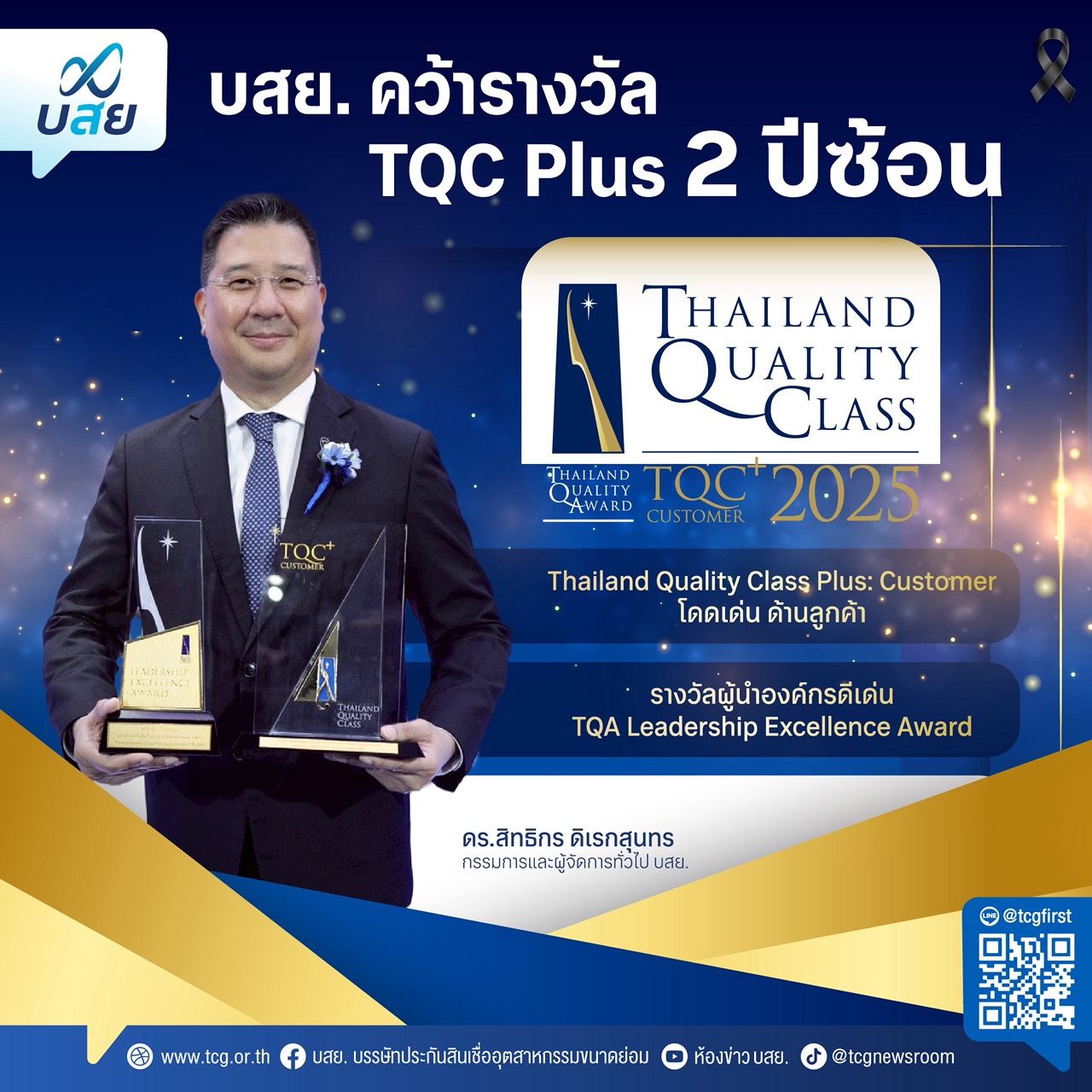 ดร.สิทธิกร ดิเรกสุนทร กรรมการและผู้จัดการทั่วไป บรรษัทประกันสินเชื่ออุตสาหกรรมขนาดย่อม (บสย.) รับ 2 รางวัลคุณภาพแห่งชาติ (Thailand Quality Award : TQA) ครั้งที่ 24 ประจำปี 2568 ประกอบด้วย รางวัลการบริหารสู่ความเป็นเลิศที่มีความโดดเด่น ด้านลูกค้า (Thailand Quality Class Plus : Customer) และ รางวัลผู้นำองค์กรดีเด่น TQA Leadership Excellence Award จัดโดยสำนักงานรางวัลคุณภาพแห่งชาติ สถาบันเพิ่มผลผลิตแห่งชาติ โดยมี นายณัฐพล รังสิตพล ปลัดกระทรวงอุตสาหกรรม เป็นประธานการมอบรางวัล ณ ห้องมัฆวานรังสรรค์บอลรูม สโมสรทหารบก ถนนวิภาวดีรังสิต เมื่อวันที่ 26 กุมภาพันธ์ 2569