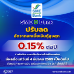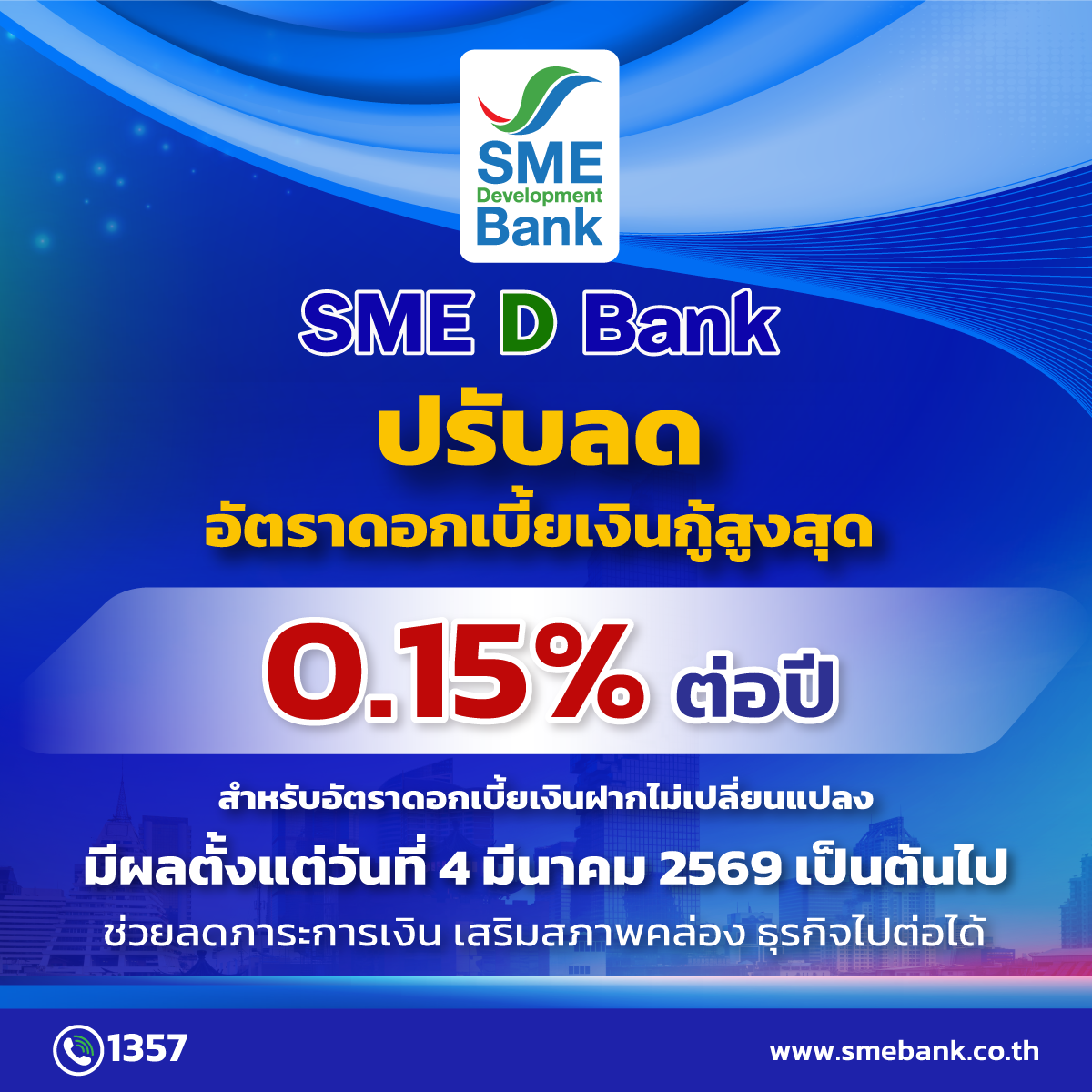 นายพิชิต มิทราวงศ์ กรรมการผู้จัดการ ธนาคารพัฒนาวิสาหกิจขนาดกลางและขนาดย่อมแห่งประเทศ ไทย (ธพว.) หรือ SME D Bank เปิดเผยว่า จากที่ประชุมคณะกรรมการนโยบายการเงิน (กนง.) เมื่อวันที่ 25 กุมภาพันธ์ 2569 มีมติลดอัตราดอกเบี้ยนโยบาย 0.25% ต่อปี จาก 1.25% เป็น 1.00% ต่อปี ดังนั้น SME D Bank ธนาคารเพื่อเอสเอ็มอีไทย ขานรับนโยบายธนาคารแห่งประเทศไทย (ธปท.) ประกาศปรับลดอัตราดอกเบี้ยเงินกู้สูงสุด 0.15% เพื่อบรรเทาภาระต้นทุนทางการเงินให้แก่ผู้ประกอบการเอสเอ็มอี และสนับสนุนการฟื้นตัวของเศรษฐกิจ โดยอัตราดอกเบี้ยเงินกู้ขั้นต่ำ (Minimum Loan Rate : MLR) อยู่ที่ 7.050% ต่อปี อัตราดอกเบี้ยลูกค้ารายย่อยชั้นดี (Minimum Retail Rate : MRR) อยู่ที่ 7.025% ต่อปี และ ประเภทเงินเบิกเกินบัญชี (Minimum Overdraft Rate : MOR) อยู่ที่ 7.150% ต่อปี มีผลตั้งแต่วันที่ 4 มีนาคม 2569 เป็นต้นไป