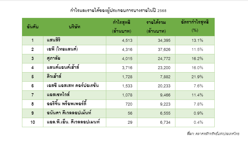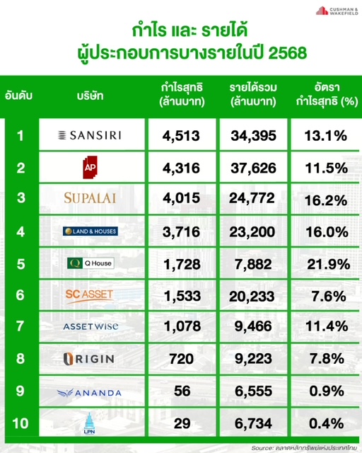 สุรเชษฐ กองชีพ หัวหน้าฝ่ายวิจัยและที่ปรึกษา คุชแมน แอนด์ เวคฟีลด์ ประเทศไทย ประเมินตลาดอสังหาริมทรัพย์ปี 2568 เป็นปีที่มีปัญหา และติดขัดหลายเรื่อง ผู้ประกอบการเกือบทุกรายมีอัตรากำไรสุทธิ จากการขายลดลง โดย แสนสิริ ครองแชมป์อันดับ 1 มีกำไรมากถึง 4,513 ล้านบาท สูงสุดในกลุ่มผู้ประกอบการพัฒนาธุรกิจอสังหาริมทรัพย์ โดยมีรายได้รวมที่ 34,395 ล้านบาท และยอดขายรวมทั้งปี อยู่ที่ 51,000 ล้านบาท โดยที่ยอดขายประมาณ 51% มาจากโครงการบ้านจัดสรร และอีก 49% มาจากโครงการคอนโดมิเนียม และมียอดการโอนกรรมสิทธิ์อยู่ที่ประมาณ 36,700 ล้านบาท แม้ว่าปีที่ผ่านมาจะเป็นปีที่ตลาดที่อยู่อาศัยมีการแข่งขันสูงมากก็ตาม แต่ด้วยความเชื่อมั่นในแบรนด์ทำให้ แสนสิริ สามารถสร้างกำไรได้มากที่สุด และยังจะมีการจ่ายเงินปันผลเพิ่มเติมอีก ซึ่งเมื่อรวมกับที่จ่ายไปแล้วตอนครึ่งปีแรกเท่ากับว่า แสนสิริ จ่ายปันผล ในปี 2568 รวมทั้งหมด 0.13 บาทต่อหุ้น