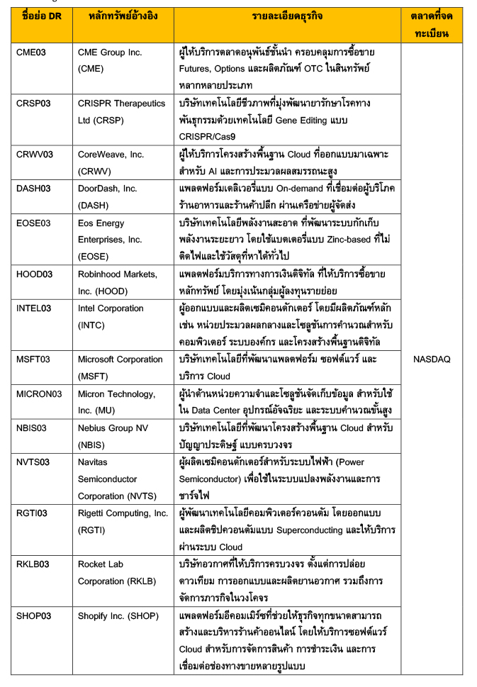 ตลาดหลักทรัพย์แห่งประเทศไทย รับจดทะเบียนตราสารแสดงสิทธิในหลักทรัพย์ต่างประเทศ (DR) 36 หลักทรัพย์ใหม่ อ้างอิงหลักทรัพย์ชั้นนำในตลาดหลักทรัพย์ฮ่องกง (HKEX) ตลาดหลักทรัพย์แนสแด็ก (NASDAQ) และตลาดหลักทรัพย์นิวยอร์ก (NYSE) ออกโดย บริษัทหลักทรัพย์ พาย จำกัด (มหาชน) (PI) และบริษัทหลักทรัพย์ หยวนต้า (ประเทศไทย) จำกัด (Yuanta) เริ่มซื้อขายในตลาดหลักทรัพย์ไทย 5 มีนาคม 2569
