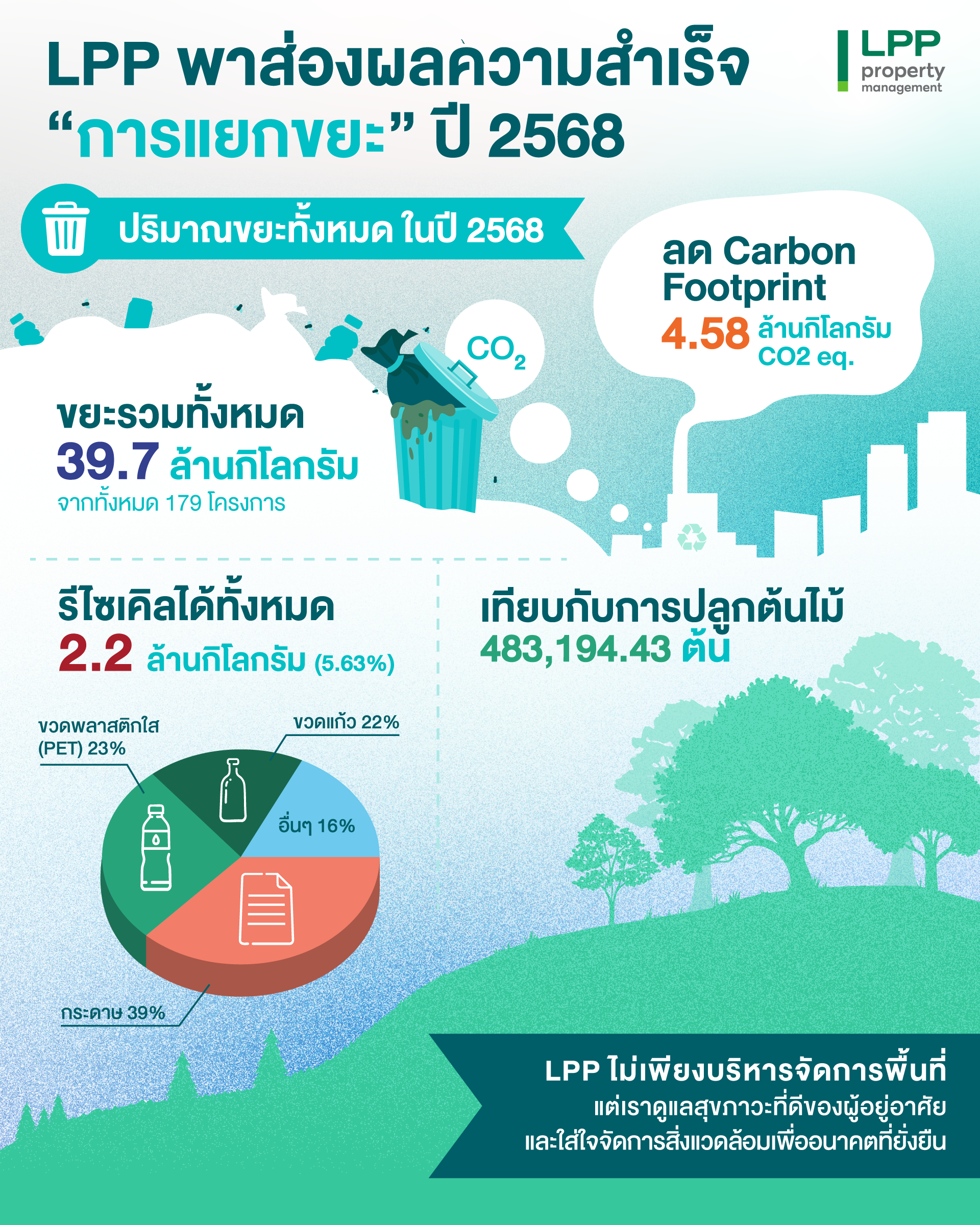 นางสาวสมศรี เตชะไกรศรี กรรมการผู้จัดการ บริษัท แอล พี พี พรอพเพอร์ตี้ มาเนจเมนท์ จำกัด (LPP) ผู้ดำเนินธุรกิจบริหารจัดการโครงการอสังหาริมทรัพย์ครบวงจร เปิดเผยว่า จากรายงานสรุปผลการดำเนินงานระหว่างเดือน มกราคม – ธันวาคม 2568 ของ LPP เป็นจำนวนขยะรวมทั้งหมด 39,748,123.59 kg.โดยสามารถบริหารจัดการคัดแยกขยะรีไซเคิลได้รวมทั้งสิ้น 2,238,796.06 กิโลกรัม ซึ่งการคัดแยกขยะอย่างมีประสิทธิภาพนี้ส่งผลเชิงบวกต่อสิ่งแวดล้อมได้อย่างมาก โดยสามารถลดปริมาณคาร์บอนฟุตพริ้นท์ (Carbon Footprint) ได้สูงถึง 4,579,770.78 kg. / CO2 eq. หรือเทียบเท่ากับการปลูกต้นไม้เพื่อดูดซับก๊าซคาร์บอนไดออกไซด์จำนวน 483,194.43 ต้น โดยมีสัดส่วนประเภทขยะที่คัดแยกได้สูงสุด 3 อันดับแรก ได้แก่ 1. กระดาษ 39% 2. ขวดพลาสติกใส (PET) 23% 3.ขวดแก้ว 22% และประเภทอื่นๆ ตามลำดับ อาทิ ขวดนม 8% กระป๋องอลูมิเนียม 2% เหล็ก 2% และขยะรีไซเคิลไม่แยกประเภท 4%