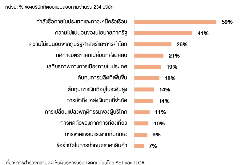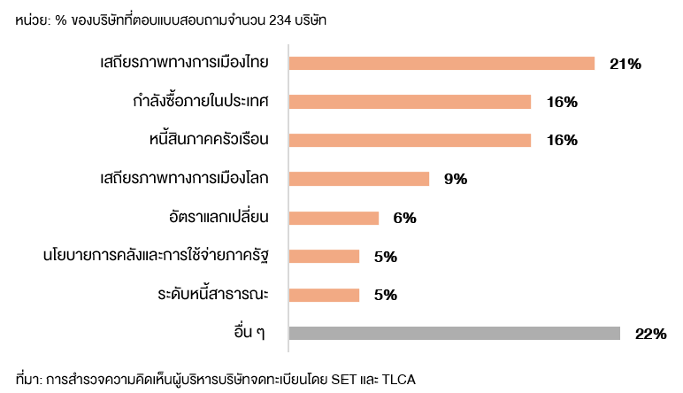 ฝ่ายวิจัย ตลาดหลักทรัพย์แห่งประเทศไทย และสมาคมบริษัทจดทะเบียนไทย สำรวจความคิดเห็นผู้บริหารบริษัทจดทะเบียนเกี่ยวกับทิศทางเศรษฐกิจ การดำเนินธุรกิจ และประเด็นที่น่าสนใจในปี 2569 รวบรวมข้อมูลในช่วงวันที่ 23 มกราคม - 13 กุมภาพันธ์ 2569* มีบริษัทจดทะเบียนร่วมแสดงความคิดเห็นทั้งสิ้น 234 บริษัท คิดเป็น 53.9% ของมูลค่าหลักทรัพย์ตามราคาตลาด โดยพบว่า