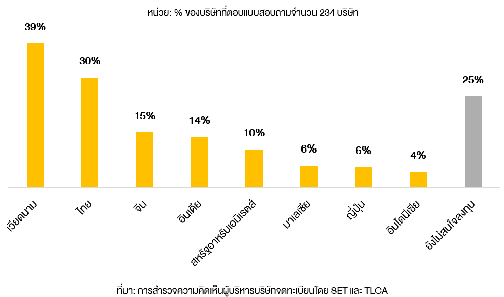 • 3 ใน 4 ของ CEO มองว่า 12 เดือนข้างหน้าเป็นจังหวะที่เหมาะสมในการลงทุน โดยให้ความสนใจทั้งประเทศไทยและอาเซียน โดยเฉพาะเวียดนามซึ่งเป็นจุดหมายหลักของหลายอุตสาหกรรม สะท้อนบทบาทในฐานะฐานการผลิตและตลาดเติบโต ขณะที่กลุ่มบริการมีการกระจายการลงทุนในหลายประเทศมากที่สุด แสดงถึงความคล่องตัวในการขยายธุรกิจ แม้บางอุตสาหกรรมยังมีท่าทีระมัดระวังต่อภาวะเศรษฐกิจและต้นทุนทางการเงิน.