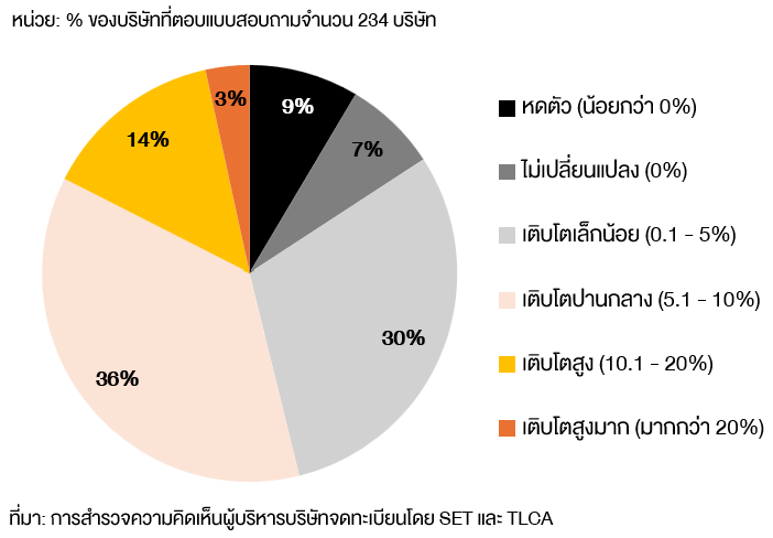 CEO ของบริษัทจดทะเบียนที่ร่วมตอบแบบสอบถามกว่า 3 ใน 4 คาดการณ์ว่า อัตราการเติบโตของเศรษฐกิจของไทยจะเติบโตได้ราว 1.1 – 2% ซึ่งอยู่ในกรอบใกล้เคียงกับการประมาณการตัวเลขทางเศรษฐกิจของสภาพัฒน์ และธนาคารแห่งประเทศไทยที่ประมาณ 2% รวมถึงการคาดการณ์ของธนาคารโลกที่ 1.6%1