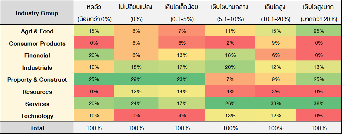 เมื่อจำแนกตามกลุ่มอุตสาหกรรม พบว่าการคาดการณ์การเติบโตของรายได้ในระดับ สูง และ สูงมาก กระจุกตัวอยู่ในกลุ่มอุตสาหกรรมบริการ เป็นหลัก สะท้อนความคาดหวังต่อการฟื้นตัวของภาคบริการ ขณะที่ภาคการเงินและอุตสาหกรรมส่วนใหญ่ประเมินการเติบโตในระดับปานกลางมากกว่า โดยเฉพาะกลุ่มอสังหาริมทรัพย์ที่มีมุมมองกระจายตัวสูง สะท้อนความไม่แน่นอนของภาวะอุปสงค์ในประเทศ
