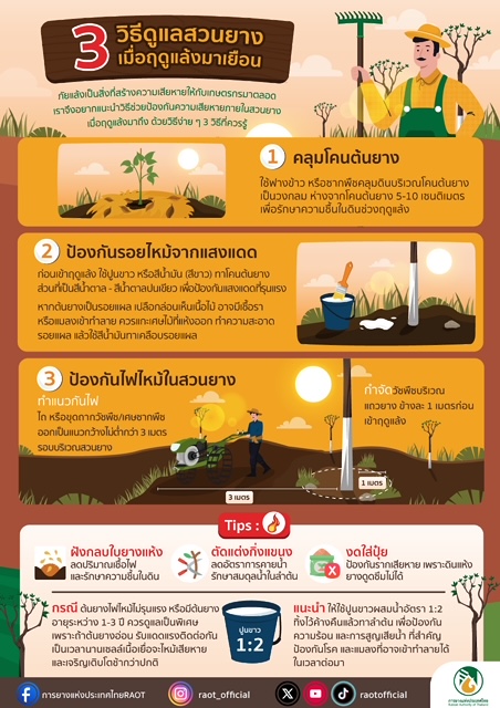 กยท. มีความห่วงใยสวนยางของเกษตรกรในช่วงที่สภาพอากาศร้อน อุณหภูมิสูง และดินขาดความชุ่มชื้น ซึ่งอาจส่งผลกระทบต่อการเจริญเติบโตของต้นยาง โดยเฉพาะสวนยางปลูกใหม่และสวนยางอายุไม่เกิน 3 ปี ที่มีความเปราะบางและเสี่ยงแห้งตาย ดังนั้น การจัดการสวนยางอย่างถูกต้องเหมาะสม และหมั่นตรวจตราดูแลสวนยางอย่างสม่ำเสมอ จะช่วยลดความเสี่ยงที่ทำให้เกิดความเสียหายจากสภาพอากาศดังกล่าว กยท. จึงขอแนะนำแนวทางการดูแลป้องกัน ดังนี้ การคลุมโคนต้นยาง กรณีต้นยางอายุ 1–3 ปี ต้นยางยังมีขนาดเล็กและร่มเงาน้อย ควรคลุมโคนต้นก่อนหน้าแล้งประมาณ 1 เดือน ด้วยวัสดุธรรมชาติในท้องถิ่น โดยเกษตรกรชาวสวนยางสามารถใช้ ฟางข้าว หญ้าแห้ง หรือเศษพืชคลุมเป็นวงกว้างราว 1 เมตร หนาประมาณ 10 เซนติเมตร เว้นระยะห่างจากโคนต้น 5–10 เซนติเมตรหรือประมาณ 1 ฝ่ามือ เพื่อรักษาความชื้นในดิน แต่ควรระมัดระวังความเสี่ยงการเกิดไฟไหม้จากวัสดุแห้งได้เช่นกัน การป้องกันรอยไหม้จากแสงแดด ต้นยางในพื้นที่แห้งแล้งอาจเกิดรอยไหม้บริเวณโคนต้น ควรใช้ปูนขาวผสมน้ำอัตรา 1:1 ทาบริเวณโคนต้น ตั้งแต่ส่วนที่ชิดกับผิวดินขึ้นมาจนสูงจากพื้นดินประมาณ 1 เมตร สำหรับต้นยางที่เกิดรอยแผลให้ใช้สีน้ำมัน