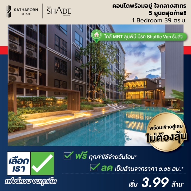 โครงการ “เดอะ เชดด์ สาทร 1” (THE SHADE SATHON 1) คอนโดมิเนียมสไตล์รีสอร์ท พร้อมอยู่ ใจกลางสาทร ใกล้ MRT ลุมพินี และ BTS ช่องนนทรี ในราคาเริ่มต้น 3.99 ล้านบาท*
