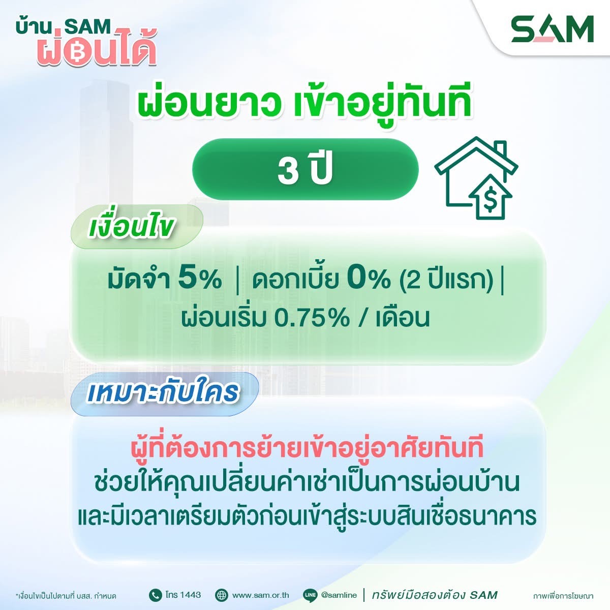 บริษัท บริหารสินทรัพย์สุขุมวิท จำกัด (บสส.) หรือ SAM เดินนหน้าภารกิจสำคัญ "ส่งมอบโอกาสเพื่อคนไทย เริ่มต้นใหม่อย่างยั่งยืน" เปิดตัวแคมเปญพิเศษ "บ้าน SAM ผ่อนได้" โดยคัดทรัพย์สินรอการขาย (NPA) ประเภทที่อยู่อาศัย ไม่ว่าจะเป็น บ้านเดี่ยว ทาวน์เฮาส์ บ้านแฝด คอนโดมิเนียม และอาคารพาณิชย์ กว่า 3,300 รายการ บนทำเลศักยภาพทั่วประเทศ ออกจำหน่ายพร้อมเงื่อนไขทางการเงินที่ช่วยประชาชนสามารถเข้าถึงที่อยู่อาศัยได้ง่ายขึ้น โดยแคมเปญพิเศษ “บ้าน SAM ผ่อนได้” ดังกล่าว ลูกค้าสามารถผ่อนชำระโดยตรงกับ SAM ได้นานสูงสุดถึง 4 ปี พร้อมรับ อัตราดอกเบี้ยพิเศษ 0% ใน 2 ปี หรือ 24 เดือนแรก โดย SAM ได้ออกแบบเงื่อนไขการผ่อนชำระให้มีความยืดหยุ่นถึง 5 ทางเลือก เพื่อให้สอดคล้องกับรายได้และความสามารถทางการเงินที่แท้จริงของลูกค้าแต่ละราย และ พิเศษยิ่งขึ้น!! สำหรับลูกค้าที่ชำระเงินครบ 5% ของราคาประกาศขาย สามารถเข้าใช้ประโยชน์ในทรัพย์สินได้ทันที ภายใต้เงื่อนไขที่กำหนด
