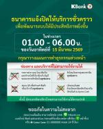 ธนาคารกสิกรไทยแจ้งปิดให้บริการชั่วคราว เพื่อพัฒนาระบบให้มีประสิทธิภาพยิ่งขึ้น ในวันอาทิตย์ที่ 15 มีนาคม 2569 เวลา 01:00 น. - 06:00 น. โดยช่องทางและบริการที่ไม่สามารถใช้งานได้ ดังนี้