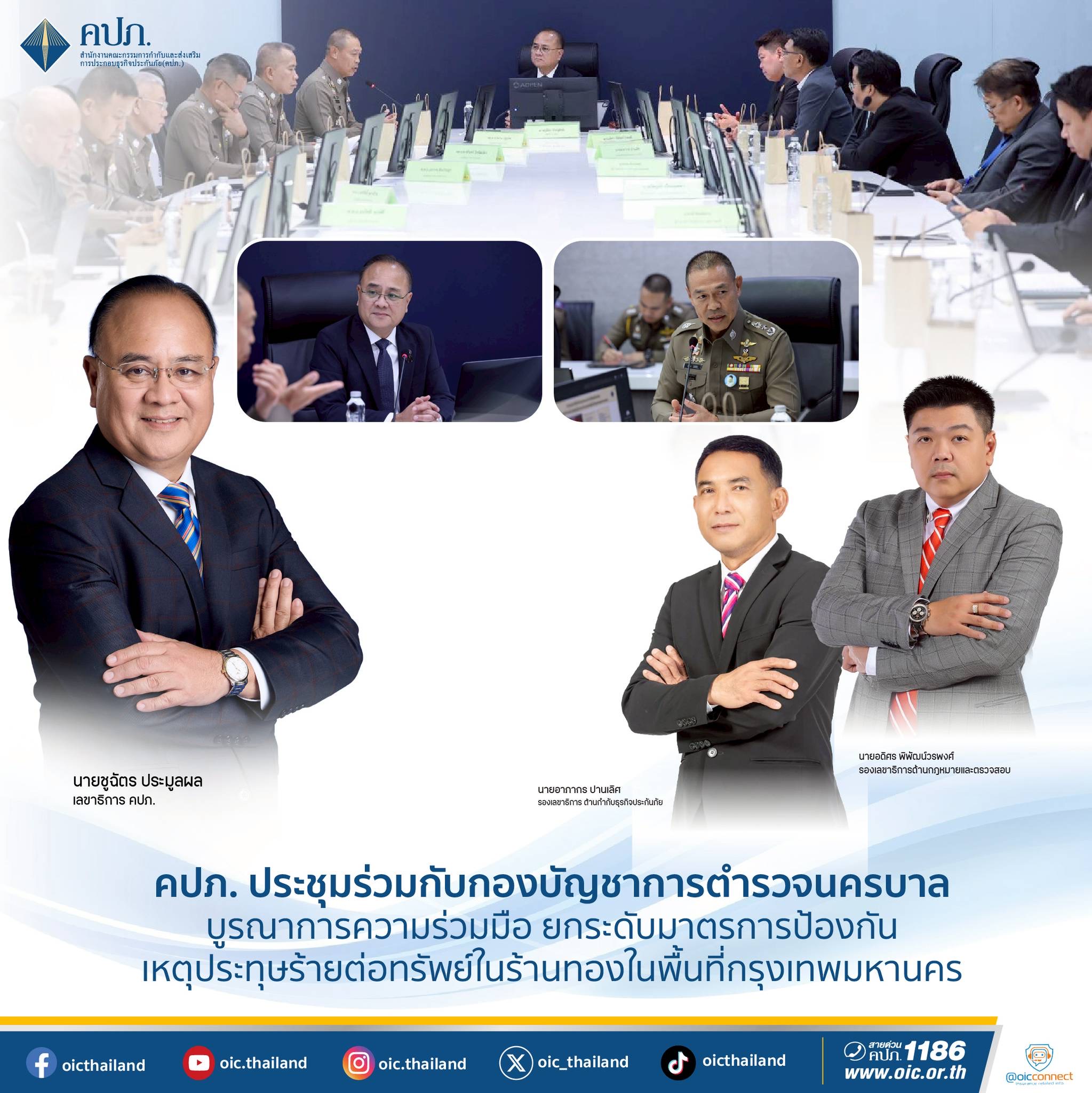 เมื่อวันที่ 5 มีนาคม 2569 สำนักงานคณะกรรมการกำกับและส่งเสริมการประกอบธุรกิจประกันภัย (สำนักงาน คปภ.) จัดการประชุมหารือกำหนดแนวทางป้องกันเหตุประทุษร้ายต่อทรัพย์ในร้านทองในพื้นที่กรุงเทพมหานคร เพื่อบูรณาการความร่วมมือระหว่างสำนักงาน คปภ. และกองบัญชาการตำรวจนครบาล ในการแลกเปลี่ยนข้อมูลและกำหนดแนวทางยกระดับมาตรการด้านความปลอดภัยของร้านทอง เพื่อลดความเสี่ยงจากเหตุประทุษร้ายต่อชีวิตและทรัพย์สินของประชาชน รวมทั้งเสริมสร้างความมั่นคงให้กับการประกอบธุรกิจร้านทองในพื้นที่กรุงเทพมหานคร โดยมี นายชูฉัตร ประมูลผล เลขาธิการคณะกรรมการกำกับและส่งเสริมการประกอบธุรกิจประกันภัย (เลขาธิการ คปภ.) เป็นประธานการประชุม พร้อมด้วย นายอดิศร พิพัฒน์วรพงศ์ รองเลขาธิการด้านกฎหมายและตรวจสอบ นายอาภากร ปานเลิศ รองเลขาธิการด้านกำกับธุรกิจประกันภัย นายจอม จีระแพทย์ ผู้ช่วยเลขาธิการ สายกฎหมายและคดี และนายไพบูลย์ เปี่ยมเมตตา ผู้ช่วยเลขาธิการ สายกำกับผลิตภัณฑ์ประกันภัย เข้าร่วมการประชุม ณ ห้องประชุม 207 สำนักงาน คปภ. ถนนรัชดาภิเษก กรุงเทพมหานคร