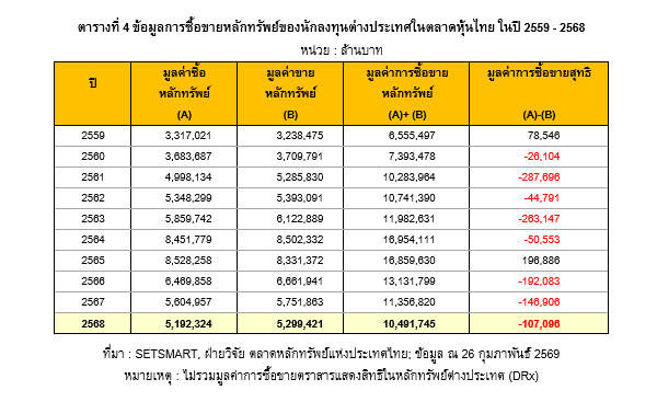 ในปี 2568 นักลงทุนต่างประเทศมีมูลค่าการซื้อขายรวมกว่า 10.49 ล้านล้านบาท หรือ 1.83 เท่า ของมูลค่าการถือครองหุ้นถัวเฉลี่ยของนักลงทุนต่างประเทศ ณ สิ้นปี 2567 และ ณ สิ้นปี 2568 ทั้งนี้ ตลอดทั้งปี 2568 นักลงทุนต่างประเทศขายสุทธิ 107,096 ล้านบาท ซึ่งเป็นการขายสุทธิใน local shares กว่า 190,000 ล้านบาท แต่ซื้อสุทธิ NVDR กว่า 87,000 ล้านบาท