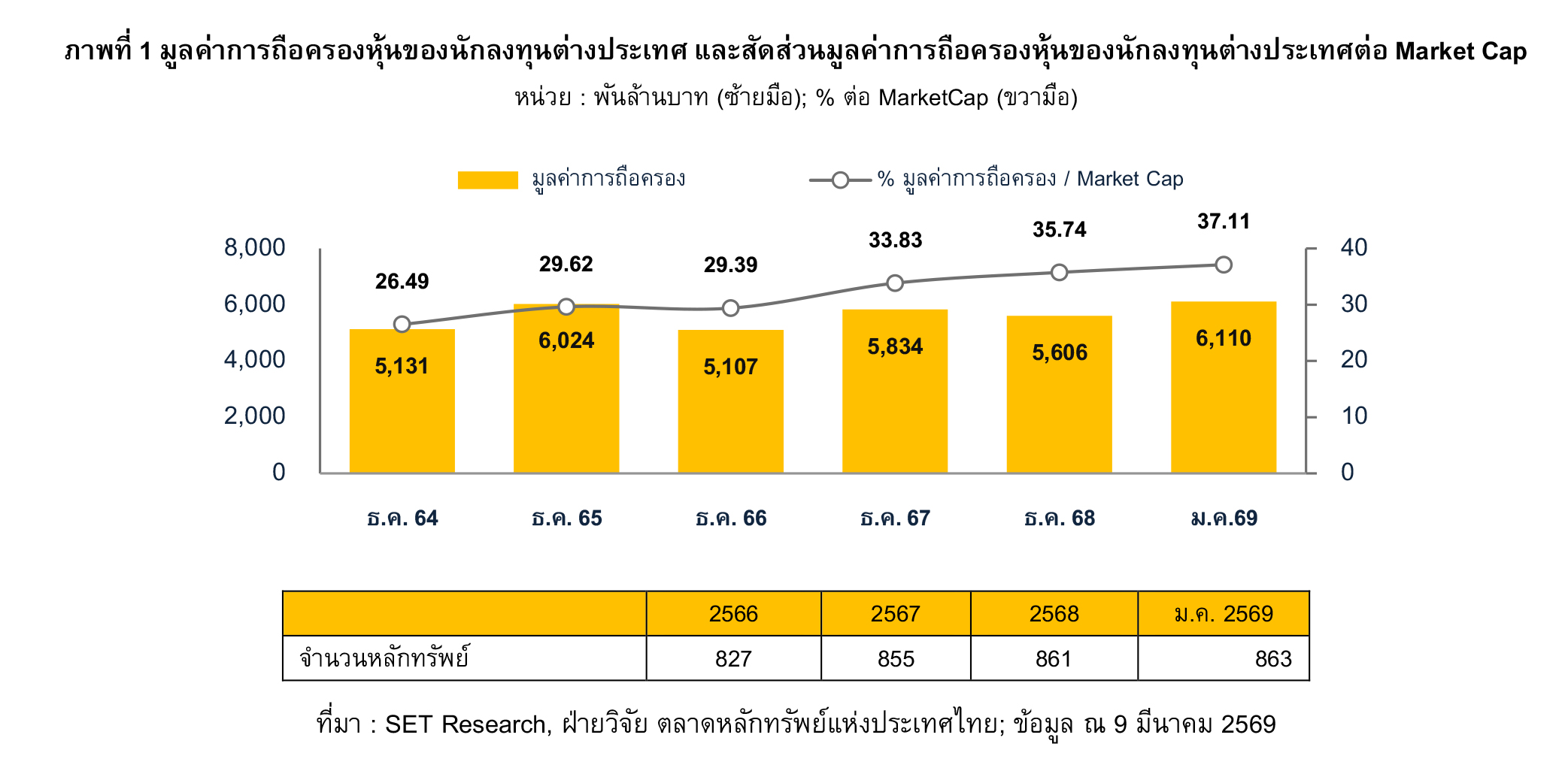 ในช่วง 2 เดือนของปี 2569 SET Index ปรับเพิ่มขึ้น กอปรกับการซื้อสุทธิต่อเนื่องของนักลงทุนต่างประเทศ ส่งผลให้มูลค่าการถือครองหุ้นของนักลงทุนต่างประเทศปรับเพิ่มขึ้นและทำสถิติสูงสุดใหม่ในเดือนมกราคม 2569 และมีแนวโน้มสูงขึ้นในเดือนกุมภาพันธ์ 2569