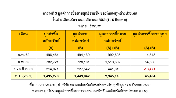 อย่างไรก็ตาม ตั้งแต่ต้นปีถึงวันที่ 6 มีนาคม 2569 นักลงทุนต่างประเทศยังคงซื้อสุทธิในตลาดหุ้นไทยรวมกว่า 45,434 ล้านบาท (ภาพที่ 2 และตารางที่ 3) ขณะที่ SET Index ปรับเพิ่มขึ้นมา 11.96% จากสิ้นปีก่อน จึงคาดการณ์ว่า มูลค่าการถือครองของนักลงทุนต่างประเทศจะเพิ่มขึ้นจากสิ้นปีก่อน