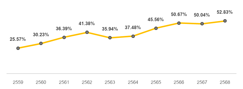 จากการศึกษาข้อมูลการถือครองหุ้นของนักลงทุนต่างประเทศ  ในตลาดหลักทรัพย์แห่งประเทศไทย และตลาดหลักทรัพย์เอ็ม เอ ไอ (ตลาดหุ้นไทย) พบว่า ณ สิ้นปี 2568 นักลงทุนต่างประเทศถือครองหุ้นของบริษัทจดทะเบียน 861 หลักทรัพย์ มีมูลค่าการถือครองหุ้นรวม 5.61 ล้านล้านบาท หรือคิดเป็น 35.74% ของมูลค่าหลักทรัพย์รวมทั้งตลาด (ภาพที่ 1) ขณะที่ ณ สิ้นปี 2567 นักลงทุนต่างประเทศถือครองหุ้นของบริษัทจดทะเบียน 855 หลักทรัพย์ มีมูลค่าการถือครองหุ้นรวม 5.83 ล้านล้านบาท หรือคิดเป็น 33.83% ของมูลค่าหลักทรัพย์รวมทั้งตลาด