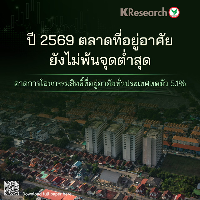 • ศูนย์วิจัยกสิกรไทย คาดว่า ตลาดที่อยู่อาศัยในปี 2569 จะยังหดตัวต่อเนื่องเป็นปีที่ 4 โดยยอดการโอนกรรมสิทธิ์ทั่วประเทศอาจลดลง 5.1% (YoY) หรือเหลือเพียงประมาณ 3.0 แสนหน่วย ต่ำที่สุดในรอบหลายปี สะท้อนถึงกิจกรรมการซื้อขายที่เปราะบาง