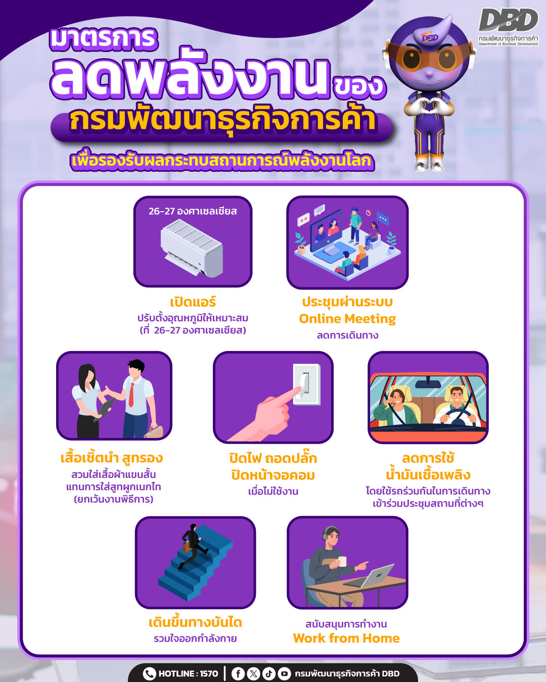 กรมพัฒนาธุรกิจการค้า ขานรับนโยบายด้านการประหยัดพลังงานของรัฐบาล กำหนด 7 มาตรการ รองรับผลกระทบสถานการณ์พลังงานโลก พร้อมกำชับหน่วยบริการต้องให้บริการตามปกติบนพื้นฐานของการประหยัดพลังงาน แนะ!! ภาคธุรกิจและประชาชนใช้บริการผ่านระบบออนไลน์ที่ปัจจุบันสามารถใช้บริการได้ครบทุกบริการ 100% แล้ว