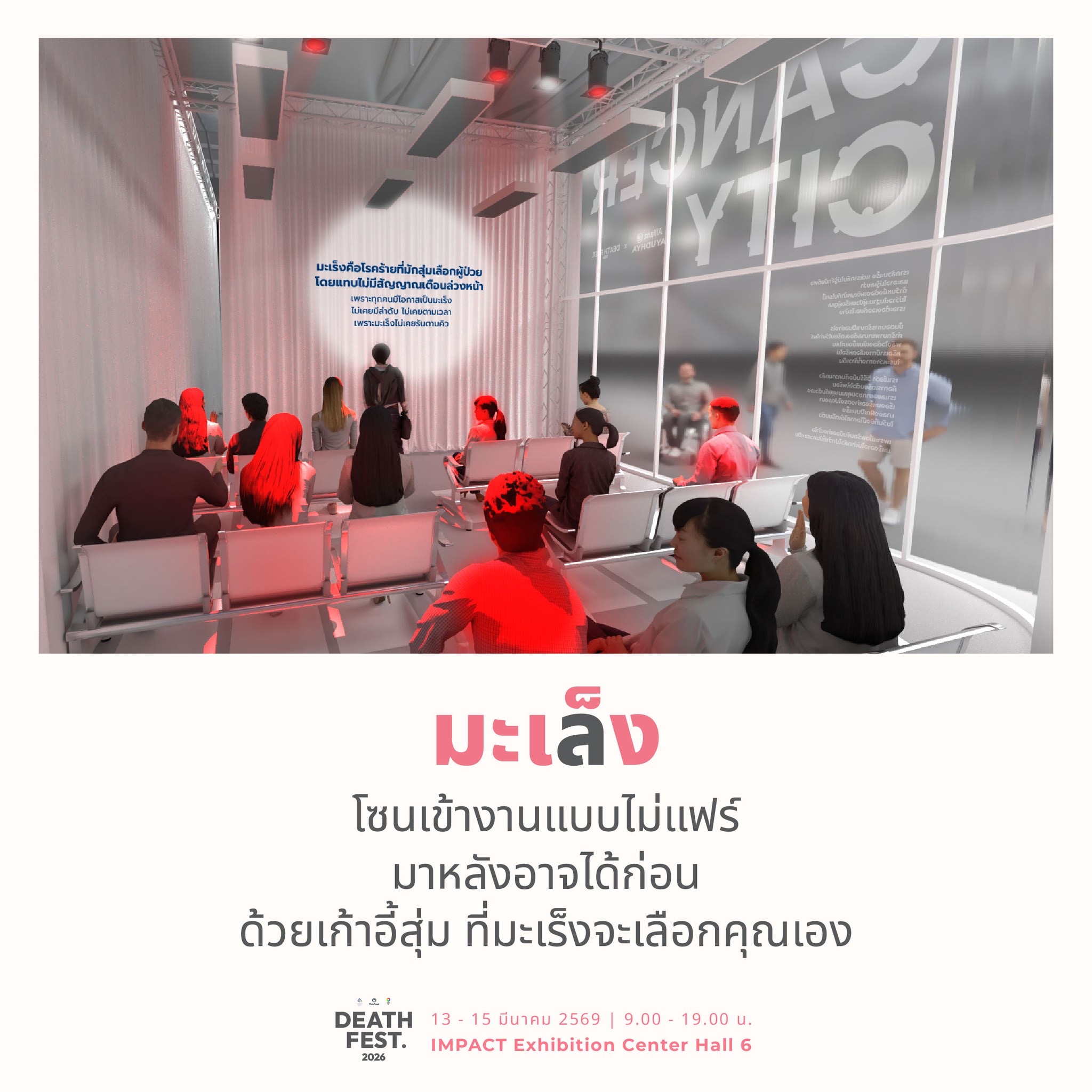 อีกหนึ่งกิจกรรมสำคัญของงานคือเวทีเสวนา Health Talk บนเวทีกลางของงาน Death Fest ในหัวข้อ “สิทธิ การรักษา ค่าใช้จ่าย ในโลกมะเร็ง: มีทางเลือกอะไรที่คนไทยควรรู้” ซึ่งจะจัดขึ้นในวันที่ 14 มีนาคม 2569 เวลา 15.00 – 16.00 น. โดยเวทีเสวนานี้จะเปิดมุมมองเกี่ยวกับสถานการณ์โรคมะเร็งในประเทศไทย ความก้าวหน้าของการรักษา รวมถึงประเด็นสำคัญเกี่ยวกับสิทธิการรักษา ค่าใช้จ่ายทางการแพทย์ และทางเลือกในการวางแผนรับมือกับโรคร้าย