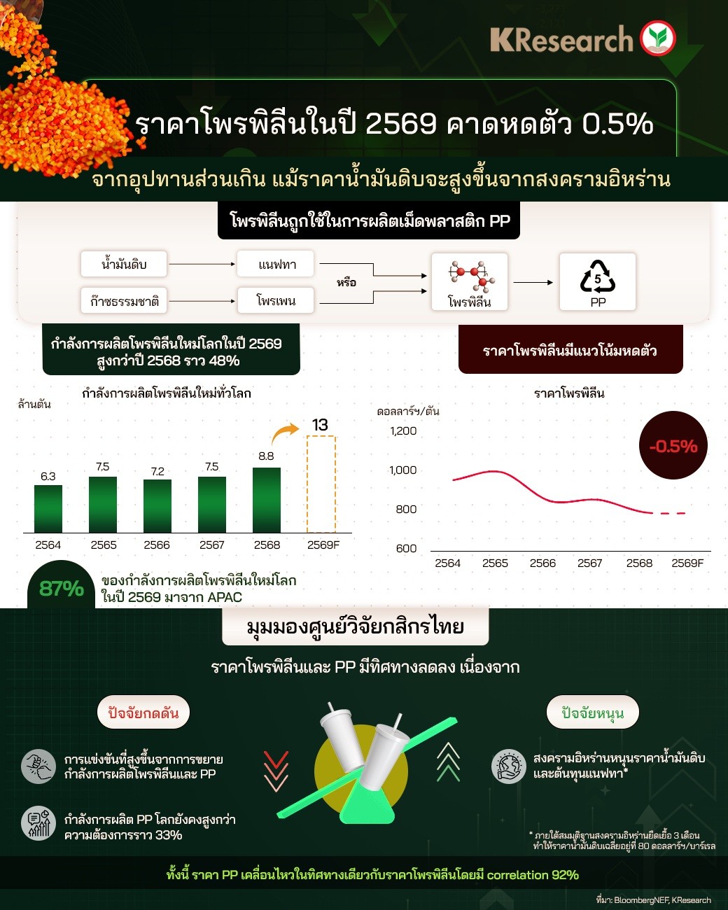 • ทั้งนี้ แม้ราคาน้ำมันดิบและต้นทุนแนฟทาจะเพิ่มขึ้นจากสงครามอิหร่าน แต่ราคาโพรพิลีนและ PP มีทิศทางลดลง เพราะการแข่งขันที่สูงขึ้นจากการขยายกำลังการผลิตโพรพิลีนและ PP ในขณะที่ กำลังการผลิต PP โลกยังคงมากกว่าความต้องการ