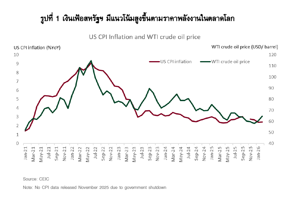 · ความเสี่ยงด้านเงินเฟ้อมีแนวโน้มเพิ่มขึ้นตามราคาพลังงานในตลาดโลก โดยอัตราเงินเฟ้อทั่วไป (CPI) ของสหรัฐฯ ทรงตัวอยู่ที่ 2.4% YoY ในเดือนก.พ. 2569 ก่อนเกิดเหตุโจมตีในตะวันออกกลาง