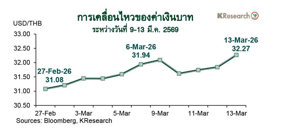 · ในวันศุกร์ที่ 13 มี.ค. 2569 เงินบาทแตะระดับอ่อนค่าสุดในรอบ 3 เดือนครึ่งที่ 32.39 ก่อนจะปิดตลาดในประเทศที่ 32.27 บาทต่อดอลลาร์ฯ เทียบกับระดับ 31.94 บาทต่อดอลลาร์ฯ ในวันศุกร์ก่อนหน้า (6 มี.ค.) สำหรับสถานะพอร์ตการลงทุนของนักลงทุนต่างชาติระหว่างวันที่ 9-13 มี.ค. 2569 นั้น นักลงทุนต่างชาติขายสุทธิหุ้นไทย 20,036 ล้านบาท และมีสถานะอยู่ในฝั่ง Net Outflows ตลาดพันธบัตรไทย 15,261 ล้านบาท (ขายสุทธิพันธบัตร 14,359 ล้านบาท และตราสารหนี้หมดอายุ 902 ล้านบาท)