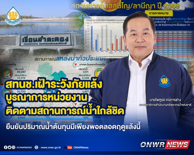 สทนช. ประสานหน่วยงานที่เกี่ยวข้อง เฝ้าติดตามและประเมินสถานการณ์น้ำอย่างต่อเนื่อง พร้อมกำชับบริหารจัดการน้ำตามแผน ควบคู่กับการประเมินความเสี่ยงจากภาวะฝนทิ้งช่วงในฤดูฝน ยืนยันปริมาณน้ำต้นทุนมีเพียงพอตลอดช่วงฤดูแล้งนี้