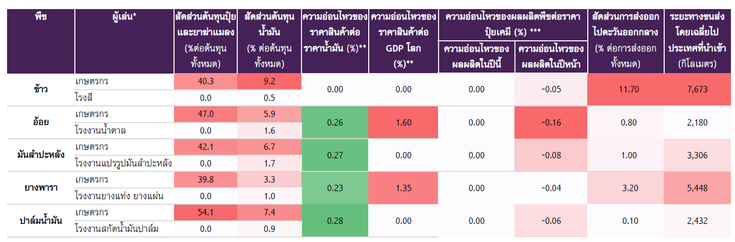 *กรณีฐาน น้ำมัน +35 pp (80 ดอลลาร์สหรัฐต่อบาร์เรล) ราคาปุ๋ย +28.6 pp GDP โลก -0.2 pp, กรณีรุนแรง น้ำมัน + 79 pp (110 ดอลลาร์สหรัฐต่อบาร์เรล) ราคาปุ๋ย +64.5 pp GDP โลก -0.9 pp และสูตรการคำนวณมีดังนี้ ผลกระทบสุทธิ (percentage point ที่เปลี่ยนแปลงไปจากค่าเดิม) = [ราคาน้ำมันที่เพิ่มขึ้น × ความอ่อนไหวของราคาต่อราคาน้ำมัน] − [ราคาน้ำมันที่เพิ่มขึ้น × สัดส่วนต้นทุนน้ำมัน] – [ราคาปุ๋ยที่เพิ่มขึ้น x สัดส่วนต้นทุนปุ๋ย] + [GDP โลกที่เปลี่ยนแปลง × ความอ่อนไหวของราคาต่อ GDP โลก]
