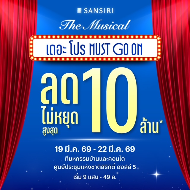 "แสนสิริ" เปิดม่านการแสดงครั้งยิ่งใหญ่ ในงานมหกรรมบ้านและคอนโด ครั้งที่ 49 สร้างปรากฎการณ์แรงสั่นสะเทือนวงการอสังหาฯ อีกครั้ง ในธีม "SANSIRI THE MUSICAL เดอะ โปร MUST GO ON!" มอบข้อเสนอพิเศษในงาน ส่วนลดสูงสุดกว่า 10 ล้าน* พบการผนึกกำลังครั้งสำคัญของแสนสิริและพันธมิตรชั้นนำกว่า 11 แบรนด์ เพื่อมอบประสบการณ์ "ความคุ้มค่า" ที่ตอบโจทย์ทุกไลฟ์สไตล์ของคนที่มองหาที่อยู่อาศัยอย่างเต็มอิ่ม ตั้งแต่วันที่ 19 - 22 มีนาคม 2569 ณ งานมหกรรมบ้านและคอนโด ครั้งที่ 49 ที่ศูนย์ประชุมแห่งชาติสิริกิติ์ ฮอลล์ 5