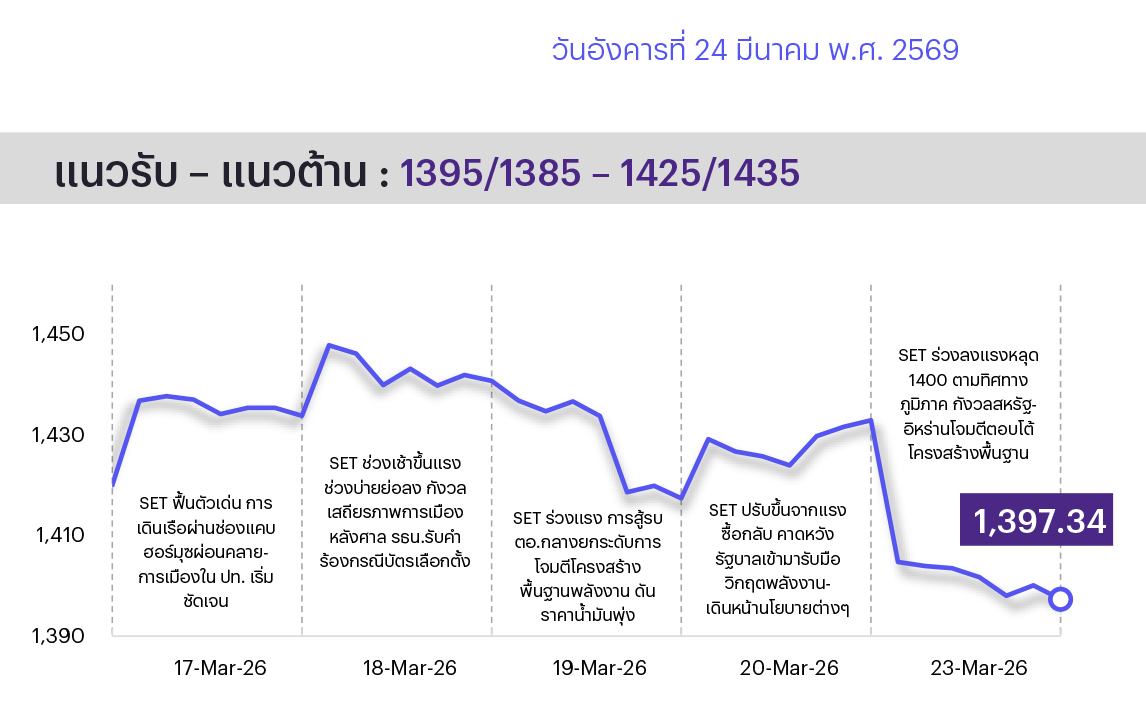 คาด SET รีบาวด์ฟื้นตัว ราคาน้ำมันร่วงลงแตะระดับ $100/bbl หลัง ปธน. ทรัมป์ระบุหารือกับอิหร่านและจะชะลอการโจมตีโรงไฟฟ้าและโครงสร้างพื้นฐานด้านพลังงานของอิหร่านออกไป 5 วัน แม้อิหร่านออกมาปฏิเสธว่าไม่ได้มีการเจรจาใดๆ แต่ก็ช่วยให้สถานการณ์ ตะวันออกกลางผ่อนคลายขึ้น ส่วนประเด็นในประเทศวันนี้ติดตามตัวเลขส่งออก-นำเข้า ก.พ. ของไทย ทางเทคนิคคาดดัชนีดีดขึ้นจากกรอบล่าง sideways แนวรับ 1395/1385 แนวต้าน 1425/1435