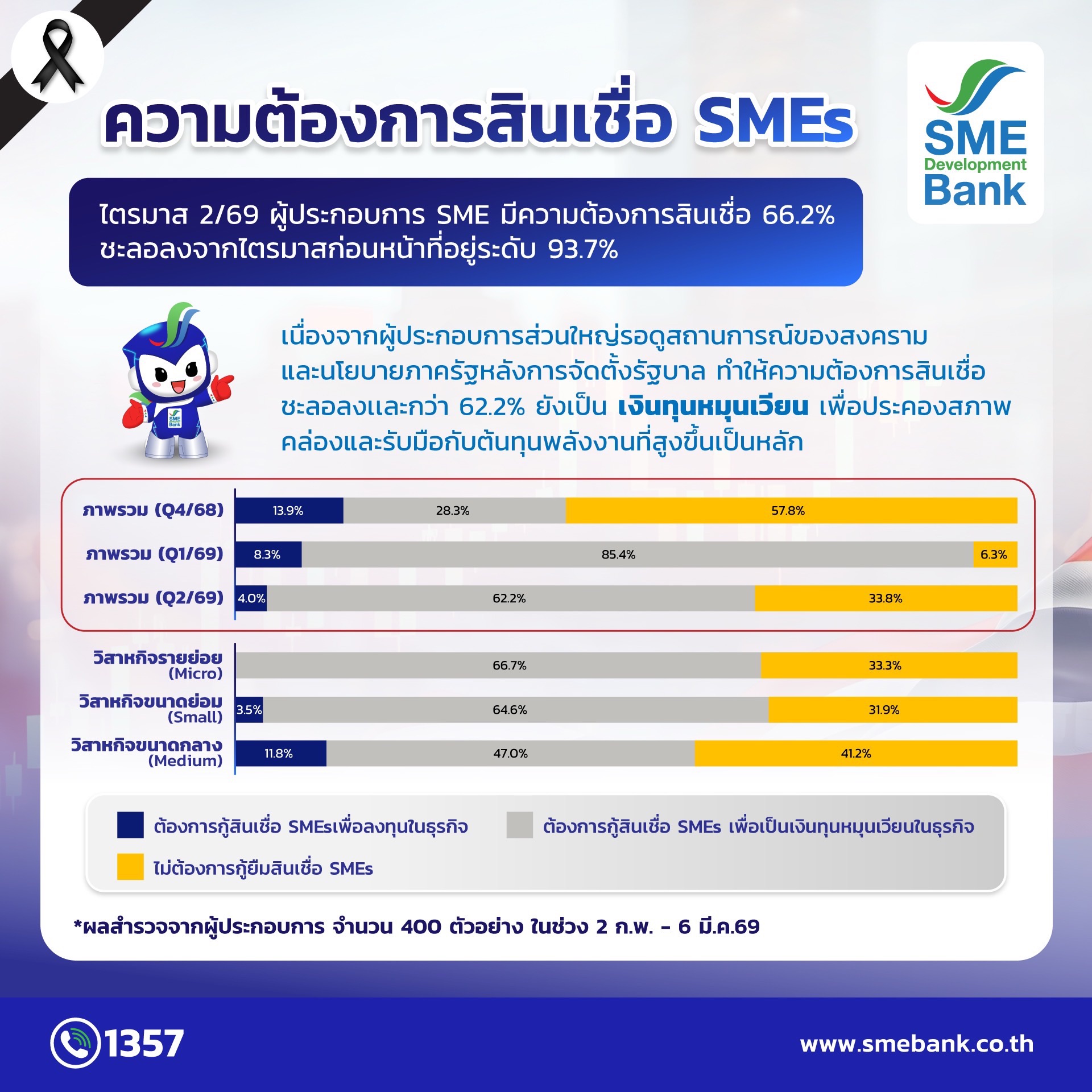 ขณะที่ คาดการณ์ 3 เดือนข้างหน้า หรือไตรมาส 2/69 ผู้ประกอบการเอสเอ็มอี มีความต้องการสินเชื่อ 66.2% ชะลอลงจากไตรมาสก่อนหน้าที่อยู่ระดับ 93.7% เนื่องจากผู้ประกอบการส่วนใหญ่รอดูสถาน การณ์ของสงคราม และนโยบายภาครัฐหลังการจัดตั้งรัฐบาล ทำให้ความต้องการสินเชื่อของเอสเอ็มอีกว่า 62.2% ยังเป็นเงินทุนหมุนเวียน เพื่อประคองสภาพคล่องและรับมือกับต้นทุนพลังงานที่สูงขึ้นเป็นหลัก