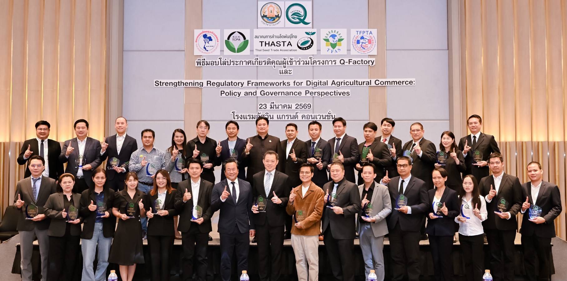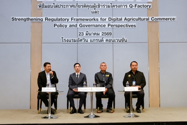 วันที่ 23 มีนาคม 2569 นายรพีภัทร์ จันทรศรีวงศ์ อธิบดีกรมวิชาการเกษตร เป็นประธานเปิดการเสวนาเรื่อง"การเสริมสร้างกรอบการกำกับดูแลการค้าสินค้าเกษตรดิจิทัล: มุมมองเชิงนโยบายและหลักธรรมาภิบาล" พร้อมมอบโล่ประกาศเกียรติคุณแก่ผู้ประกอบการในโครงการ Q-FACTORY ประจำปี 2568 ณ โรงแรมอัศวิน แกรนด์ คอนเวนชั่น กรุงเทพมหานคร โดยมีผู้บริหารจากหน่วยงานภาครัฐ ภาคเอกชน และภาคีเครือข่ายที่เกี่ยวข้องเข้าร่วมอย่างคับคั่ง
