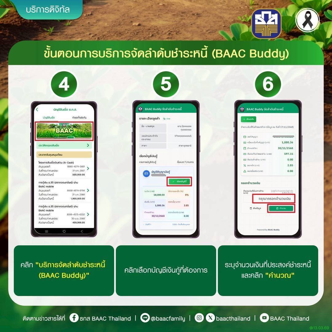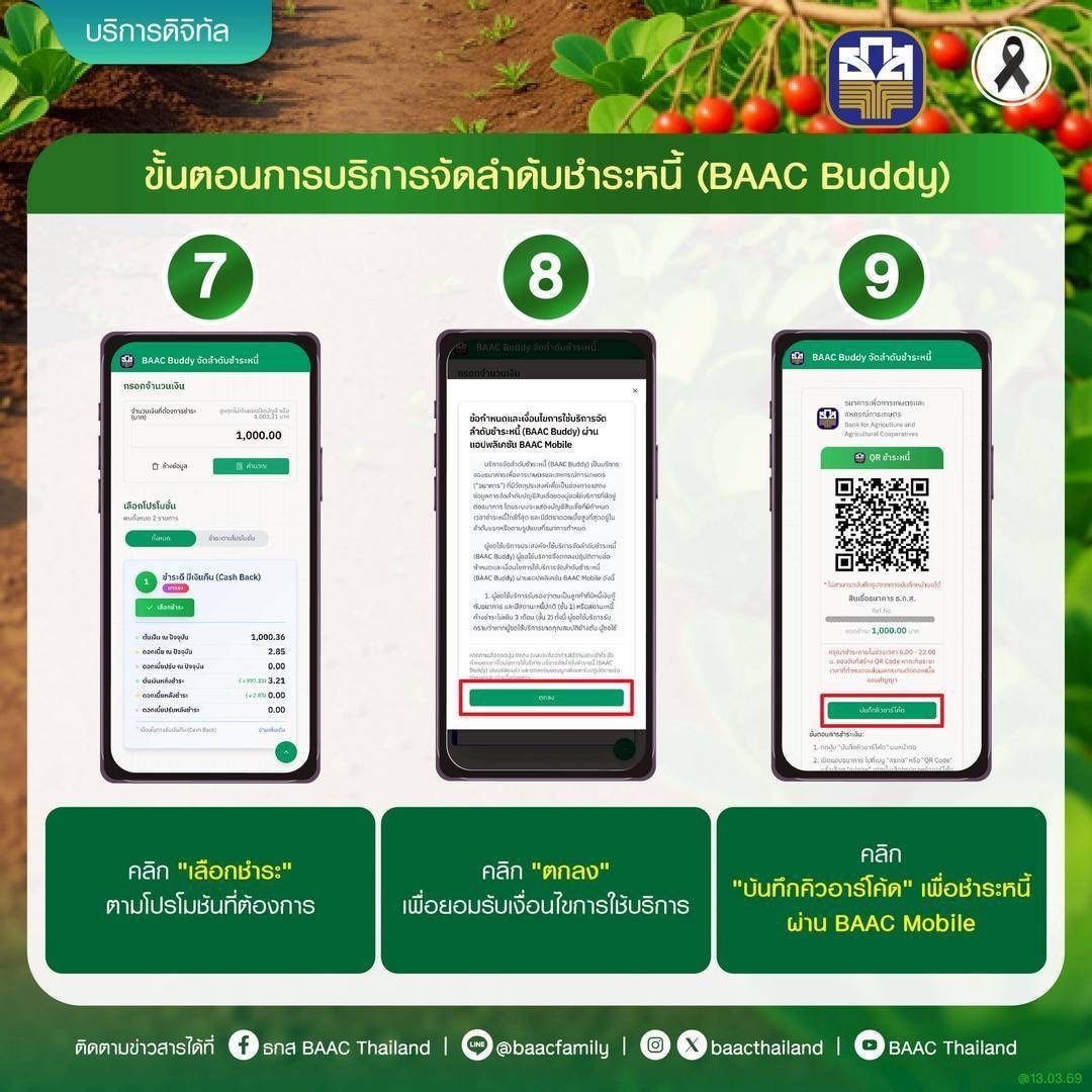 นายฉัตรชัย ศิริไล ผู้จัดการธนาคารเพื่อการเกษตรและสหกรณ์การเกษตร (ธ.ก.ส.) กล่าวว่า ธ.ก.ส. ได้นำเทคโนโลยีและนวัตกรรมฟีเจอร์ใหม่ผ่านแอปพลิเคชัน BAAC Mobile ภายใต้ชื่อ “BAAC Buddy” มาช่วยตอบโจทย์ของเกษตรกรที่มีหนี้หลายสัญญาและตรวจเช็คว่าหนี้สัญญาใดที่จะครบกำหนด พร้อมการแนะนำการชำระหนี้ของเกษตรกรที่จะได้รับประโยชน์สูงสุด ซึ่งนอกจากเป็นการรักษาวินัยทางการเงิน ที่เป็นการสร้างเครดิตให้กับลูกค้าแล้วยังช่วยในเรื่องของการลดภาระดอกเบี้ย และโอกาสในการรับสิทธิพิเศษจากโครงการต่าง ๆ ของรัฐที่เข้ามาสนับสนุน รวมถึงโปรโมชันที่ธนาคารจัดขึ้น ซึ่งฟีเจอร์ดังกล่าวจะทำให้เกษตรกรรับรู้สถานะหนี้ของตนเองได้ทุกที่ ทุกเวลา สะดวกสบาย และสามารถกำหนดลำดับความสำคัญของการชำระหนี้แต่ละบัญชีได้ด้วยตนเอง เช่น แผนการผ่อนชำระให้เหมาะสมกับกระแสเงินสดรับในแต่ละเดือน ไม่ว่าจะเป็นการเลือกชำระหนี้ก่อนครบกำหนด โดยระบบจะช่วยคำนวณและแนะนำแนวทางการชำระหนี้ที่เหมาะสมแบบเรียลไทม์ นอกจากนี้ ยังมาพร้อมเครื่องมือวิเคราะห์ ภาระหนี้โดยรวมของผู้ใช้งานแสดงภาพรวมของยอดคงค้าง อัตราดอกเบี้ย และระยะเวลาการชำระหนี้ เพื่อช่วยให้ลูกค้า สามารถตัดสินใจทางการเงินได้แบบมีข้อมูลรองรับ และยังช่วยลดค่าใช้จ่ายการเดินทาง เพราะสามารถชำระหนี้ผ่าน แอปพลิเคชัน BAAC Mobile ได้ทันที ทั้งกรณีชำระปกติ หรือชำระตามโปรโมชันที่ธนาคารกำหนด อาทิ “ชำระดีมีเงินคืน (Cash Back)” ภายใต้โครงการ ชำระดีมีโชค (สิ้นสุด 31 มีนาคม 2569) และแคมเปญ “BAAC Buddy จ่ายดี มีวินัยได้เงิน” (สิ้นสุด 30 เมษายน 2569) เป็นต้น