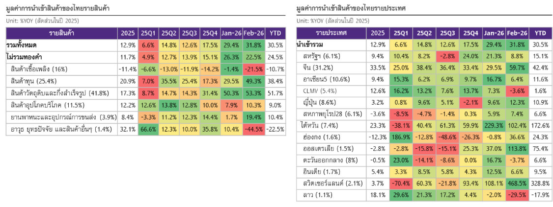 (2) สินค้าทุนขยายตัวสูง 49.3% เร่งขึ้นจาก 29.5% ในเดือนก่อน ซึ่งมีส่วนช่วยให้การส่งออกไทยเดือนนี้ขยายตัวเพิ่มขึ้น (CTG) 11.7% ของการเติบโตส่งออกรวม 31.8% โดยสินค้าหลัก ได้แก่ เครื่องจักรไฟฟ้าและส่วนประกอบ และเครื่องจักรกลและส่วนประกอบที่ขยายตัวถึง 91.0% และ 19.2% ตามลำดับ (CTG: 6.8% และ 1.4%) ส่วนหนึ่งอาจเป็นผลมาจากการที่ไทยยังผลิตสินค้าทุนประเภทนี้ได้จำกัด ขณะที่แนวโน้มการลงทุนในอุตสาหกรรมเทคโนโลยี เช่น Data center เพิ่มขึ้น ส่งผลให้ความต้องการนำเข้าสินค้าทุน หมวดเครื่องจักรและเทคโนโลยีเพิ่มขึ้นตามดุลการค้า (ระบบศุลกากร) เดือนนี้ขาดดุลต่อเนื่อง -2,833.6 ล้านดอลลาร์สหรัฐ ภาพรวม 2 เดือนแรกของปีนี้ ไทยขาดดุลการค้าสะสม -6,137.1 ล้านดอลลาร์สหรัฐ