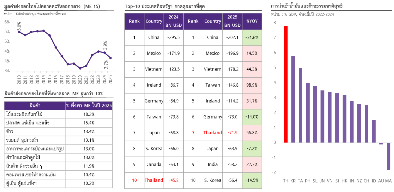 SCB EIC พบว่าสหรัฐฯ ขาดดุลการค้าไทยเพิ่มขึ้นในปี 2025 โดยไทยขยับขึ้นมาอยู่ในอันดับ 7 ของประเทศที่เกินดุลการค้ากับสหรัฐฯ สูงที่สุด จากเดิมอยู่อันดับ 10 ในปี 2024 สถานการณ์นี้สะท้อนว่าไทยมีความเสี่ยงสูงที่อาจถูกสหรัฐฯ เก็บภาษีนำเข้าเพิ่มเติมหลังเดือน ก.ค. ภายใต้มาตรา 301 นี้ได้หลังการสวบสวน (รูปที่ 5 กลาง)