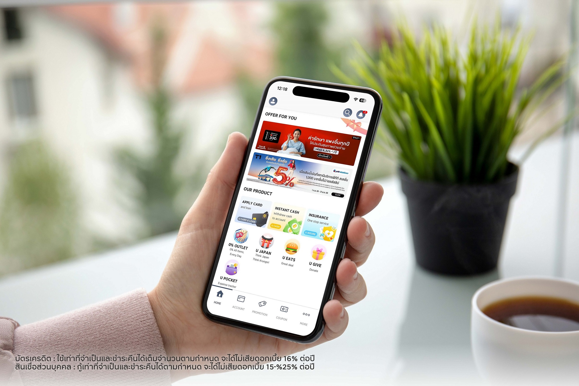 สำหรับช่วงเปิดตัวฟีเจอร์ “0% OUTLET” ในแอปพลิเคชัน UCHOOSE สมาชิกบัตรฯ สัมผัสประสบการณ์ช้อปปิงได้อย่างสะดวกและปลอดภัยบนแอปพลิเคชัน UCHOOSE ตั้งแต่ 1 มีนาคม 2569 - 30 กันยายน 2569 ผ่อนซื้อสินค้าผ่านฟีเจอร์ “0% OUTLET” รับสิทธิ์ผ่อนสินค้า 0% ทุกชิ้น พร้อมรับคุ้มอีก 3 ต่อ ต่อที่ 1 : หากผ่อนสินค้าชิ้นแรก รับส่วนลดทันที 33% จากยอดผ่อนชำระ สูงสุดไม่เกิน 500 บาท/เซลส์สลิป เพียงกรอกโค้ด “First” ที่ช่องคูปองในหน้าสรุปการผ่อนชำระ ต่อที่ 2 : หากทำรายการผ่อนระหว่าง 1 เมษายน 2569-30 พฤษภาคม 2569 รับเครดิตเงินคืนเพิ่ม 1,000 บาท เมื่อผ่อนชำระสินค้าผ่านบัตรฯ ตั้งแต่ 5,000 บาทขึ้นไป/เซลส์สลิป พิเศษ! ร่วมรับเครดิตเงินคืนสำหรับโปรโมชันผ่อนชำระจากช่องทางปกติ (เงื่อนไขเป็นไปตามที่บริษัทกำหนด) ข้อมูลเพิ่มเติม www.krungsriconsumer.com/0-percent-outlet ทั้งนี้ บัตรเครดิต : ใช้เท่าที่จำเป็นและชำระคืนได้เต็มจำนวนตามกำหนด จะได้ไม่เสียดอกเบี้ย 16% ต่อปี, สินเชื่อส่วนบุคคล : กู้เท่าที่จำเป็นและชำระคืนได้ตามกำหนด จะได้ไม่เสียดอกเบี้ย 15-%25% ต่อปี”