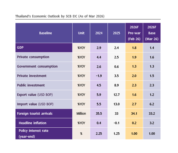 SCB EIC ปรับลดประมาณการเศรษฐกิจไทยปี 2569 เหลือ 1.4% (เดิม 1.8%) จากผลกระทบของสงครามตะวันออกกลาง ที่ทำให้ราคาพลังงานและสินค้าโภคภัณฑ์สูงขึ้นมาอย่างรวดเร็ว อัตราเงินเฟ้อทั่วไปไทยเฉลี่ยทั้งปีจะเร่งตัวขึ้นมากเกินกรอบเป้าหมายของ ธปท. อยู่ที่ 3.2% ขณะที่การใช้จ่ายในประเทศจะชะลอลง โดยเฉพาะการบริโภคที่มีแนวโน้มจะถูกกระทบจากกำลังซื้อครัวเรือนและความเชื่อมั่นที่ลดลงตามราคาพลังงานและอาหารที่ปรับสูงขึ้น และจากรายได้แรงงานที่แท้จริงที่หดตัว สำหรับภาคธุรกิจจะได้รับแรงกดดันจากต้นทุนที่สูงขึ้นและอัตรากำไรที่ลดลง ธุรกิจจะชะลอการลงทุนจากความไม่แน่นอนที่สูงขึ้น เสถียรภาพเศรษฐกิจจะมีความเปราะบางมากขึ้นจากแนวโน้มโอกาสการขาดดุลบัญชีเดินสะพัด การขาดดุลเงินทุนเคลื่อนย้าย และการขาดดุลการคลังที่สูงขึ้น (triple deficits)