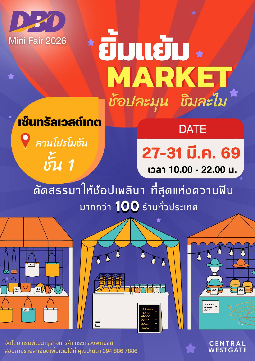 โอกาสนี้ ขอเชิญชวนผู้สนใจร่วม “ช้อปและชิม” สินค้าคุณภาพดีจากผู้ประกอบการชุมชนทั่วประเทศ ได้ที่งาน“ยิ้มแย้ม Market : ช้อปละมุน ชิมละไม” ระหว่างวันที่ 27-31 มีนาคม 2569 ณ ลานโปรโมชัน ชั้น 1 ศูนย์การค้าเซ็นทรัลเวสต์เกต จ.นนทบุรี หรือ สอบถามรายละเอียดเพิ่มเติมได้ที่ กองธุรกิจภูมิภาคและชุมชน กรมพัฒนาธุรกิจการค้า กระทรวงพาณิชย์ โทร.0 2547 4445 Call Center 1570 และเว็บไซต์กรมพัฒนาธุรกิจการค้า www.dbd.go.th