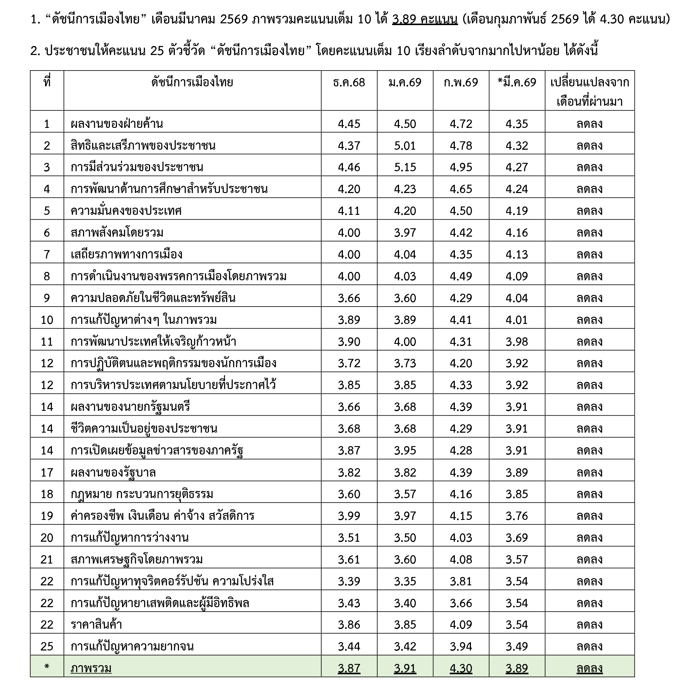 "สวนดุสิตโพล" มหาวิทยาลัยสวนดุสิต สำรวจความคิดเห็นประชาชนทั่วประเทศ เรื่อง "ดัชนีการเมืองไทย ประจำเดือนมีนาคม 2569" กลุ่มตัวอย่าง จำนวน 2,181 คน (สำรวจทางออนไลน์และภาคสนาม) ระหว่างวันที่ 24-27 มีนาคม 2569 โดยมีตัวชี้วัด 25 ประเด็นที่บ่งบอกถึงความเชื่อมั่นต่อการเมืองไทยในด้านต่าง ๆ ซึ่งแต่ละตัวชี้วัดจะมีคะแนนเต็ม 10 คะแนน สรุปผลเรียงลำดับจากค่าคะแนนสูงสุดไปถึงต่ำสุด ได้ดังนี้
