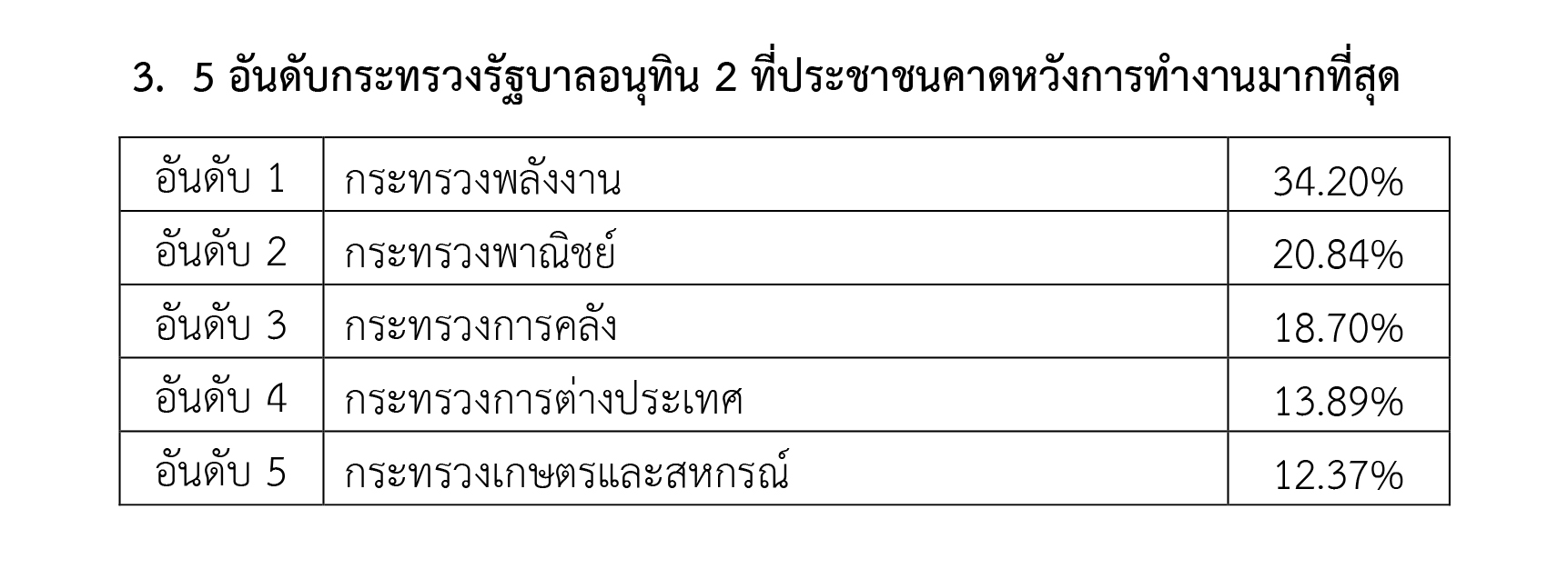 ผู้ช่วยศาสตราจารย์ยอดชาย ชุติกาโม อาจารย์ประจำหลักสูตรรัฐศาสตร์ โรงเรียนกฎหมายและการเมือง มหาวิทยาลัยสวนดุสิต อธิบายว่า จากผลการสำรวจพบว่าดัชนีทุกตัวมีตัวเลขที่ลดลงต่ำกว่าเดือนกุมภาพันธ์ทั้งหมดและเป็นที่น่าสังเกตว่า ประชาชนให้คะแนนดัชนีแต่ละตัวส่วนใหญ่ไม่ถึง 5 จากคะแนนเต็ม 10 มาตั้งแต่เดือนธันวาคม 2568 ทั้งนี้หากเรียงลำดับจากมากไปน้อยจะพบว่า ผลงานของฝ่ายค้านได้คะแนนมากที่สุด 4.35 แต่ก็ลดลงจากเดือนธันวาคม 2568 ที่เคยทำได้ถึง 4.45 ขณะที่การแก้ปัญหาความยากจนซึ่งเป็นประเด็นใหญ่และเป็นนโยบายการหาเสียงของทุกพรรคการเมืองในช่วงเลือกตั้ง กลับได้คะแนนเพียง 3.49 ขณะที่กระทรวงพลังงานได้รับความคาดหวังมากที่สุดจากประชาชนสะท้อนให้เห็นถึงความเดือดร้อนของประชาชนภายในประเทศ ณ เวลานี้อย่างชัดเจน ซึ่งเป็นเรื่องที่รัฐบาลจำเป็นต้องแก้ไขอย่างเร่งด่วน และควรพูดความจริงกับประชาชนอย่างตรงไปตรงมาถึงสถานการณ์ที่เกิดขึ้น และอธิบายถึงแนวทางแก้ไขที่ชัดเจน ฝ่ายค้านเองก็ควรแสดงบทบาทในการแสวงหาทางออกร่วมกับรัฐบาล มากกว่าการโต้คารมโวหารเพื่อชิงความได้เปรียบทางการเมือง โดยเอาประชาชนที่กำลังเดือดร้อนมาเป็นตัวประกัน ซึ่งท้ายที่สุดแล้วประเทศไทยก็ไม่ต่างอะไรกับรัฐที่ล้มเหลวในภาวะสงคราม